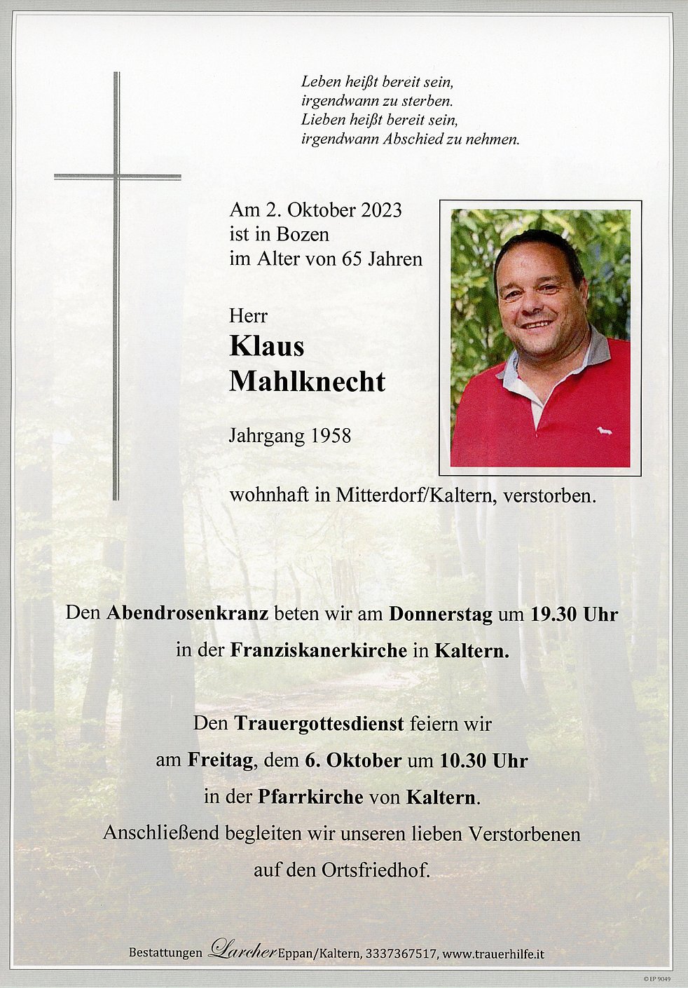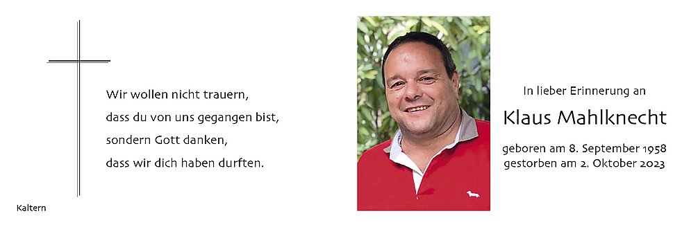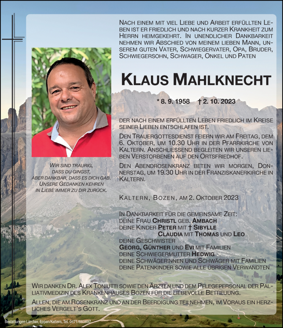Den Trauergottesdienst feiern wir am Freitag, dem 6. Oktober um 10.30 Uhr in der Pfarrkirche von Kaltern. Anschließend begleiten wir unseren lieben Verstorbenen auf den Ortsfriedhof.
