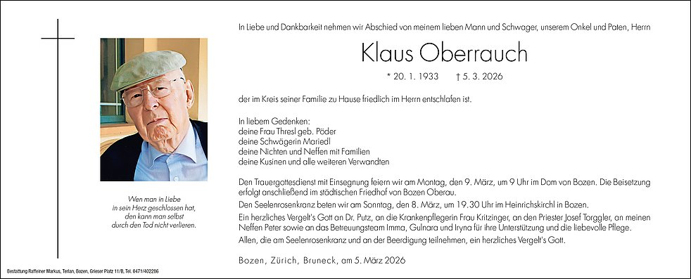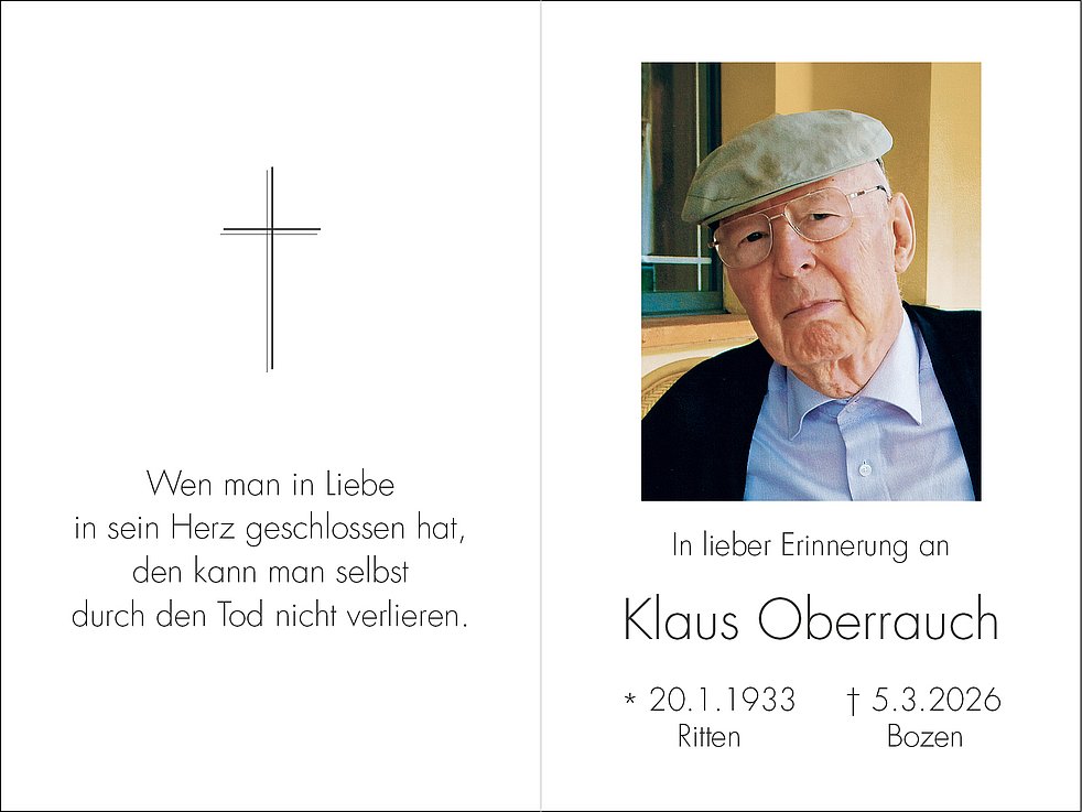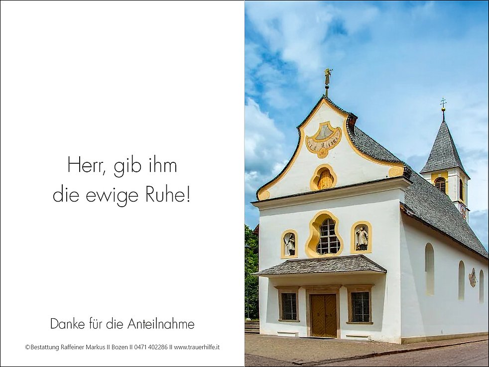 Den Trauergottesdienst mit Einsegnung feiern wir am Montag, den 9. März, um 9 Uhr im Dom von Bozen. Die Beisetzung erfolgt anschließend im städtischen Friedhof von Bozen Oberau.