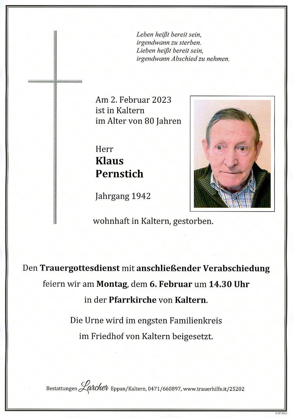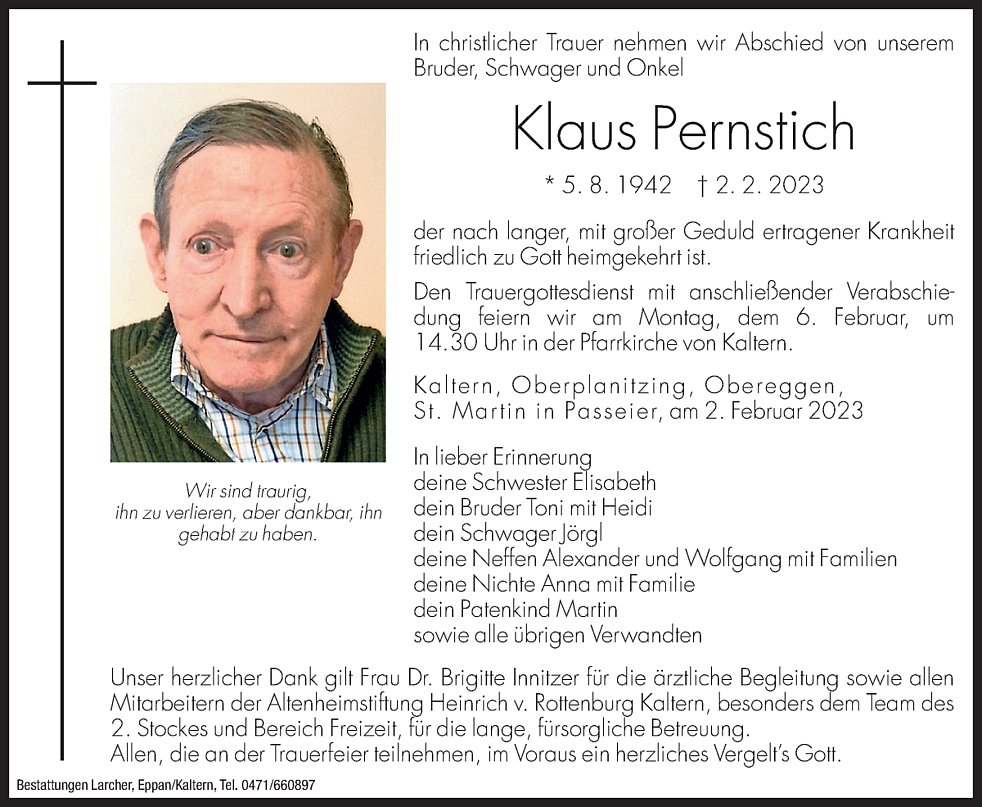 Den Trauergottesdienst mit anschließender Verabschiedung feiern wir am Montag, dem 6. Februar um 14.30 Uhr in der Pfarrkirche von Kaltern.