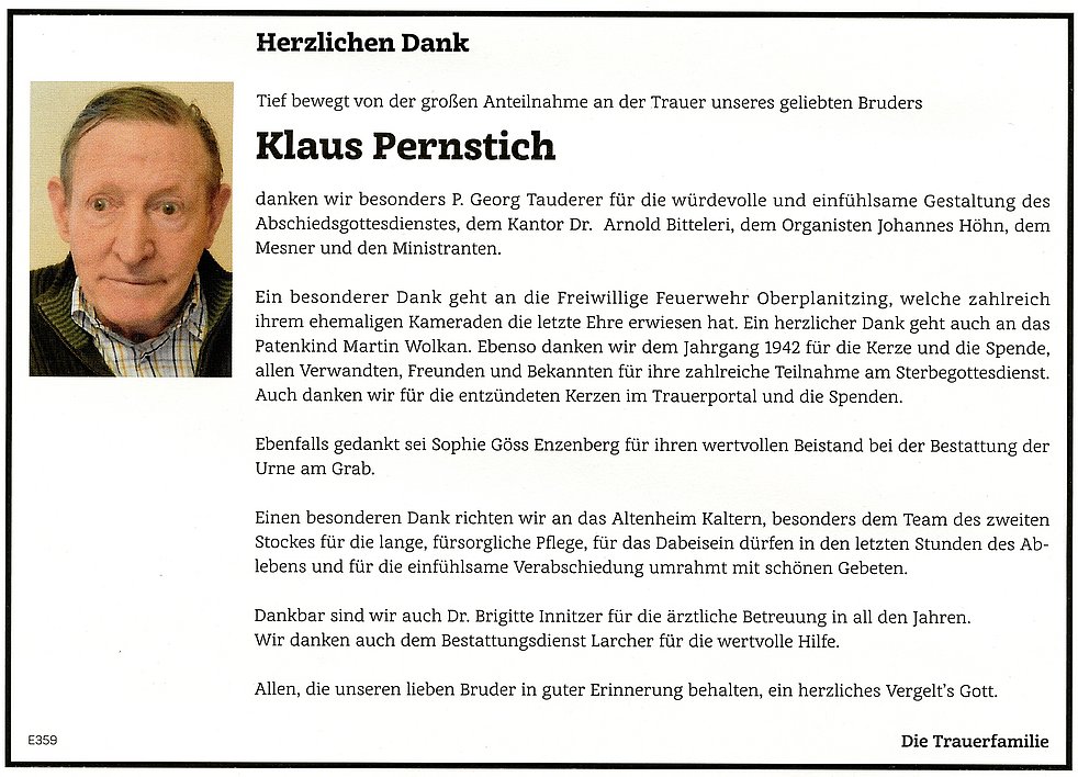 Allen, die an der Trauerfeier teilnehmen im Voraus ein herzliches Vergelt’s Gott.