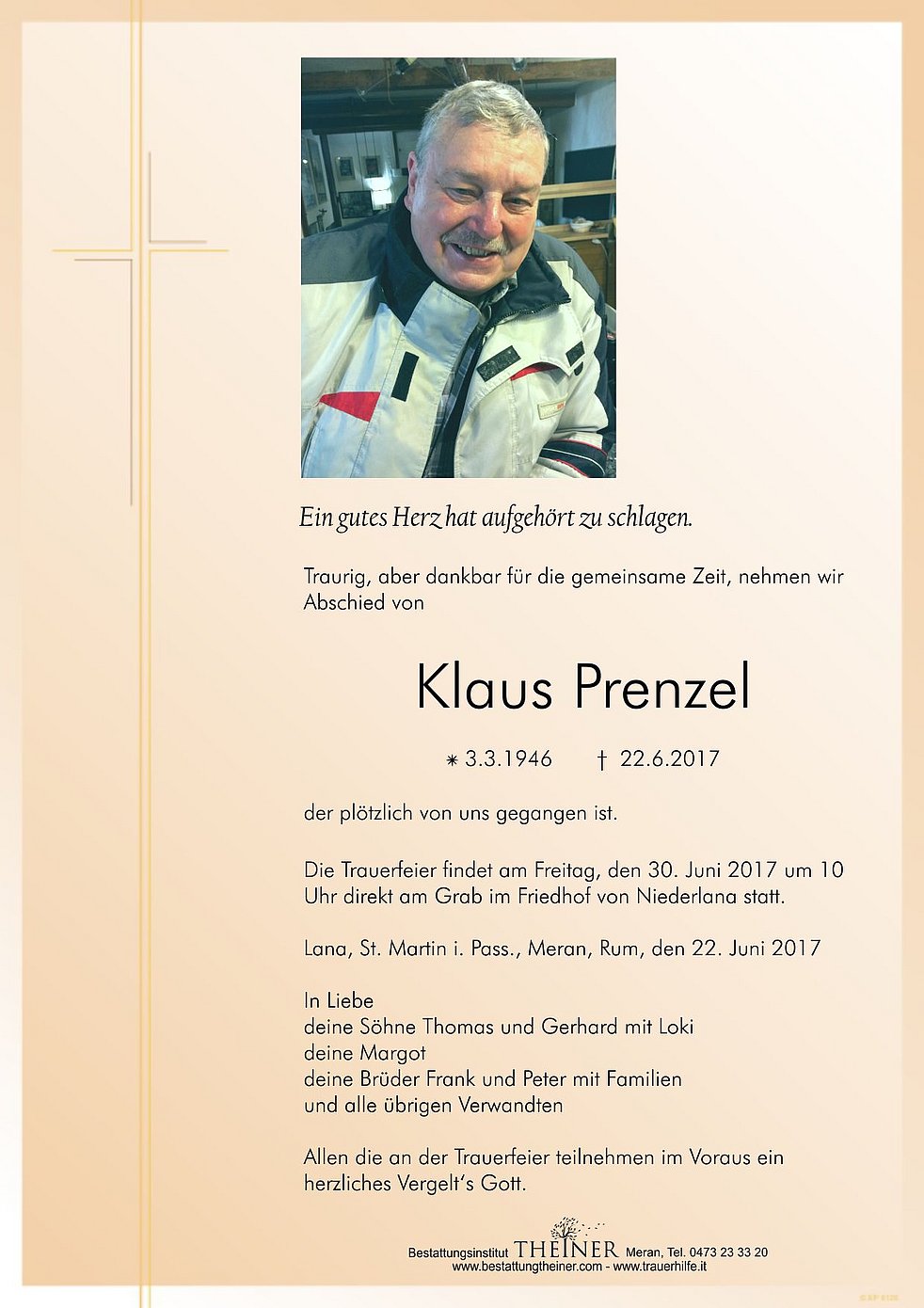 Die Trauerfeier findet am Freitag, den 30. Juni 2017 um 10 Uhr direkt am Grab im Friedhof von Niederlana statt.