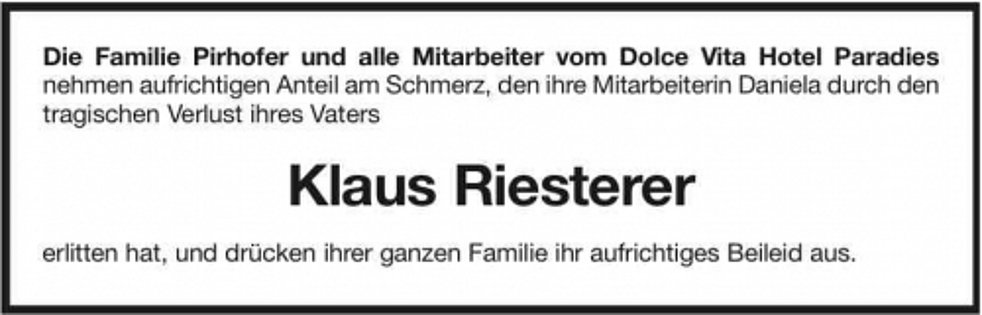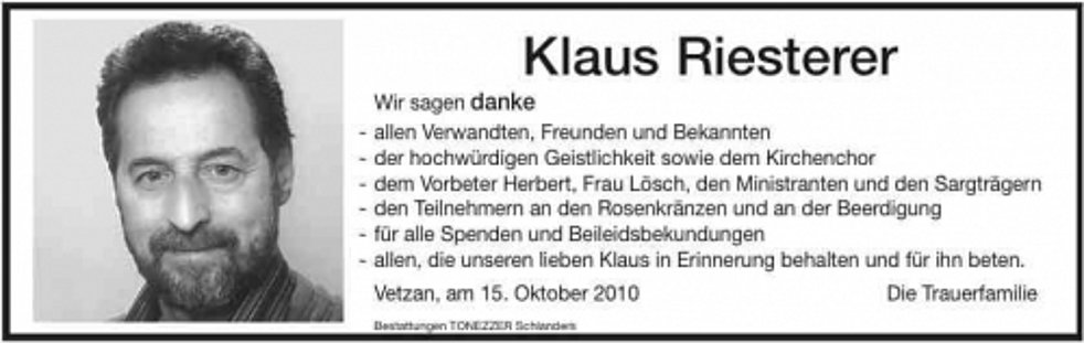 Wir begleiten unseren lieben Klaus am Freitag, 8. Oktober, um 14 Uhr vom Trauerhaus (Vetzanerhof) aus zum Begräbnisgottesdienst in die St. Nikolaus-Kirche und anschließend zur Beerdigung auf den Ortsfriedhof von Vetzan.