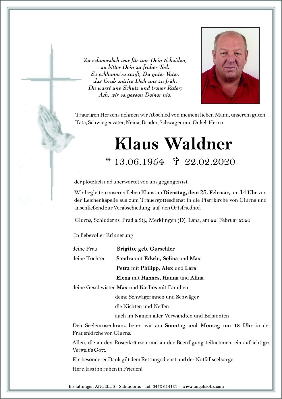 Wir begleiten unseren lieben Klaus am Dienstag, dem 25. Februar, um 14 Uhr von der Leichenkapelle aus zum Trauergottesdienst in die Pfarrkirche von Glurns und anschließend zur Verabschiedung auf den Ortsfriedhof.