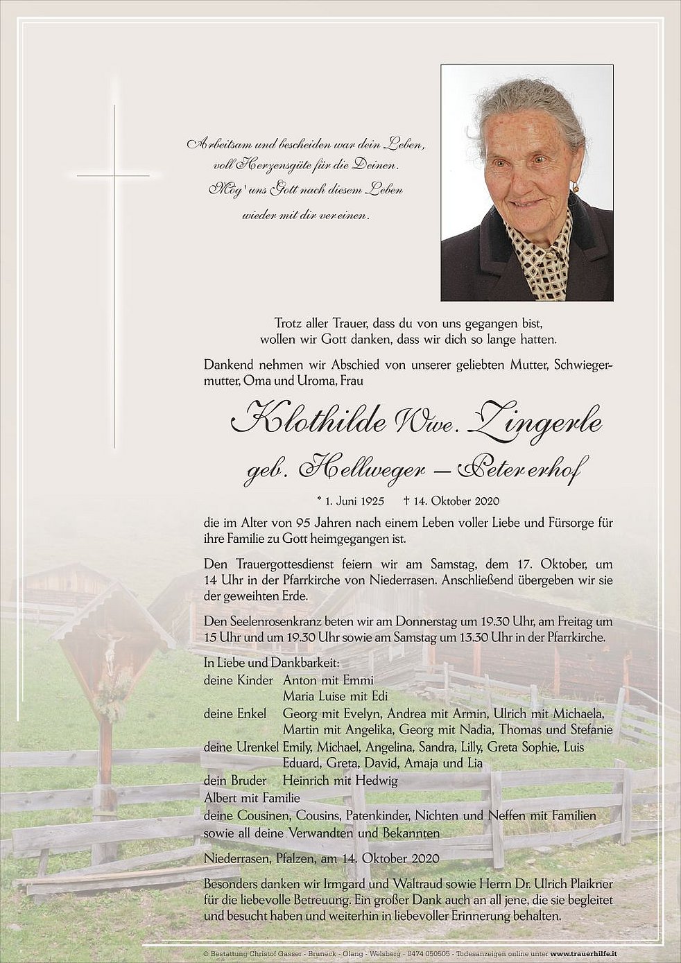 14 Uhr in der Pfarrkirche von Niederrasen. Anschließend übergeben wir sie der geweihten Erde.