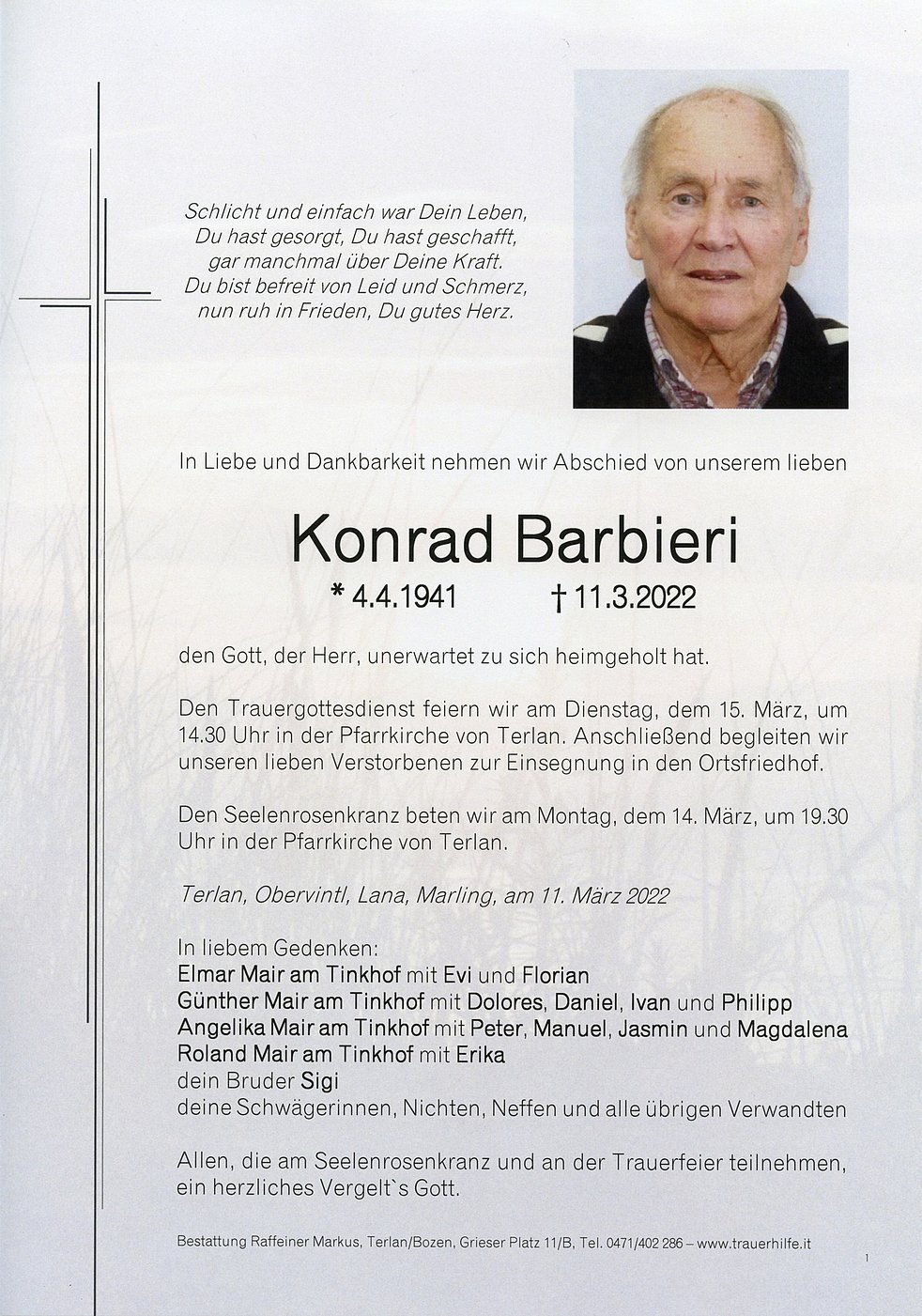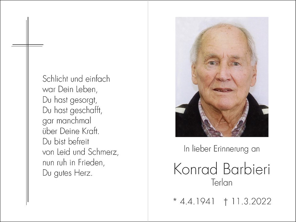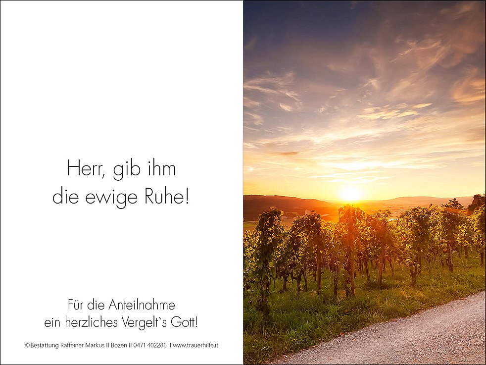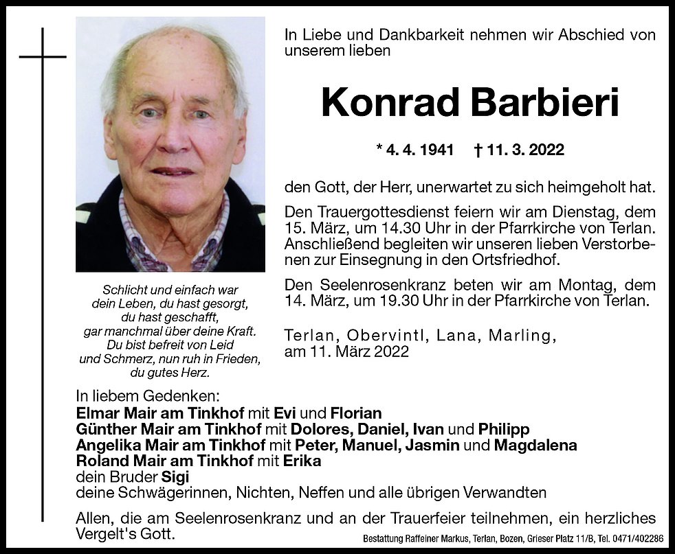 Den Trauergottesdienst feiern wir am Dienstag, dem 15. März, um 14.30 Uhr in der Pfarrkirche von Terlan. Anschließend begleiten wir unseren lieben Verstorbenen zur Einsegnung in den Ortsfriedhof.