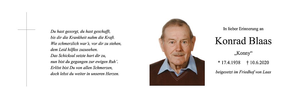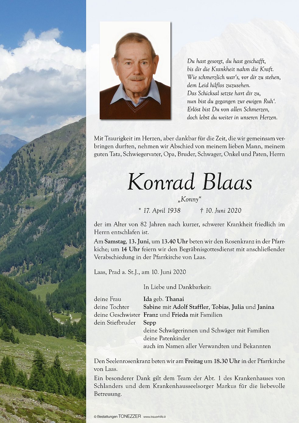 Am Samstag, 13. Juni, um 13.40 Uhr beten wir den Rosenkranz in der Pfarrkiche; um 14 Uhr feiern wir den Begräbnisgottesdienst mit anschließender Verabschiedung in der Pfarrkirche von Laas.