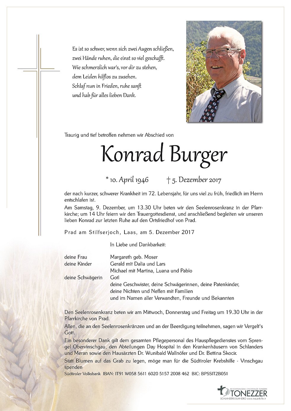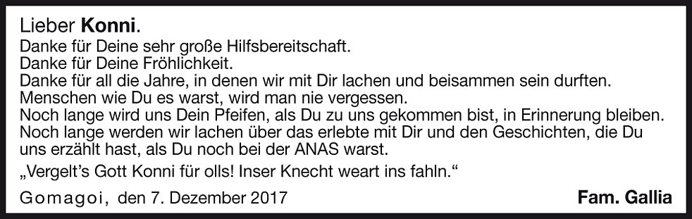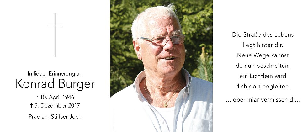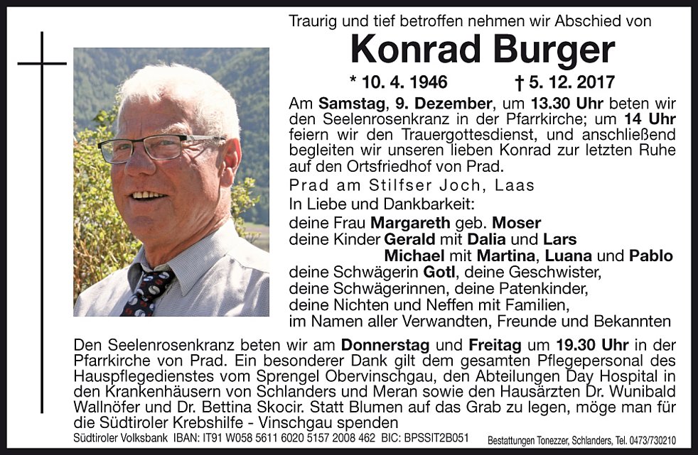 Am Samstag, 9. Dezember, um 13.30 Uhr beten wir den Seelenrosenkranz in der Pfarrkirche; um 14 Uhr feiern wir den Trauergottesdienst, und anschließend begleiten wir unseren lieben Konrad zur letzten Ruhe auf den Ortsfriedhof von Prad.