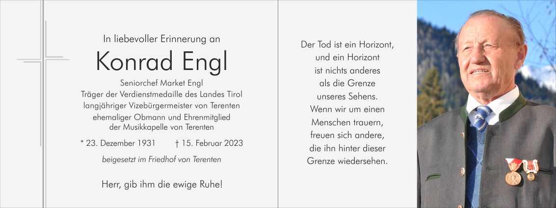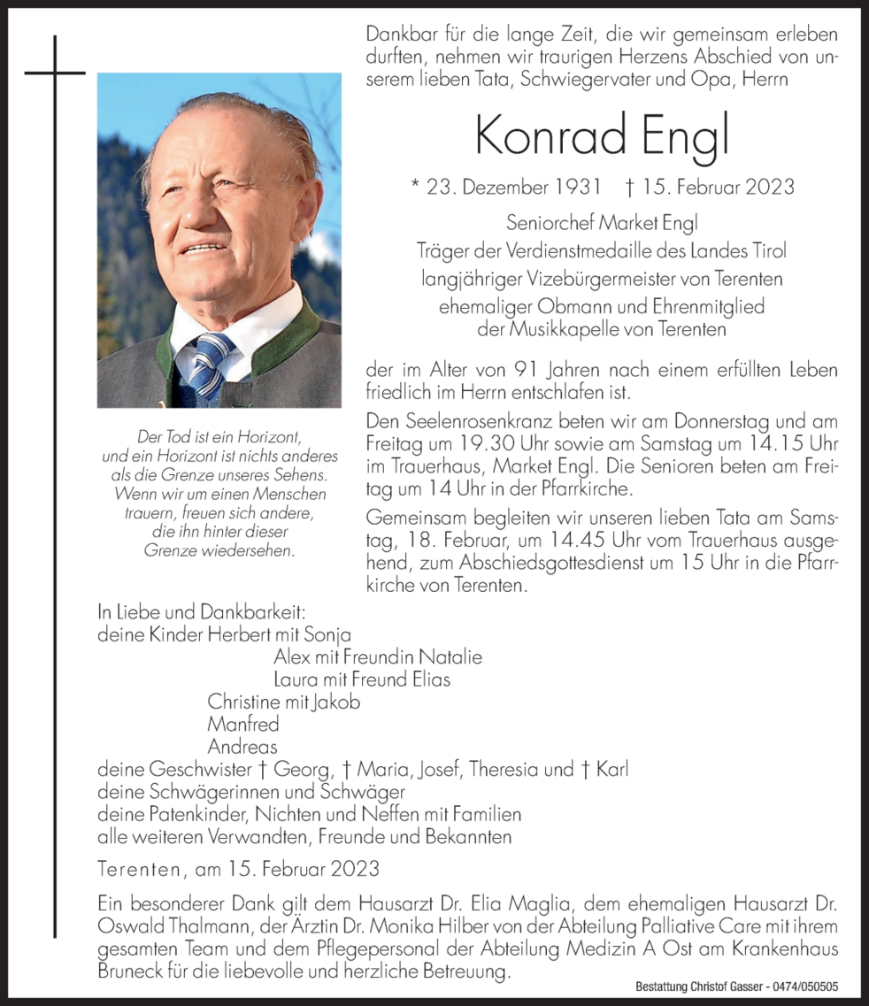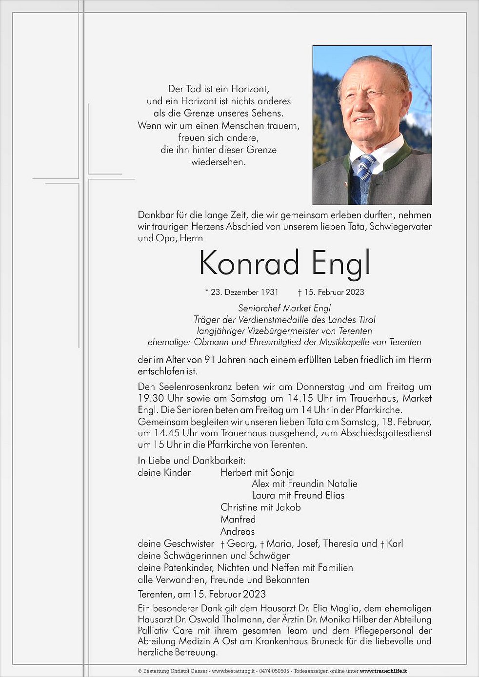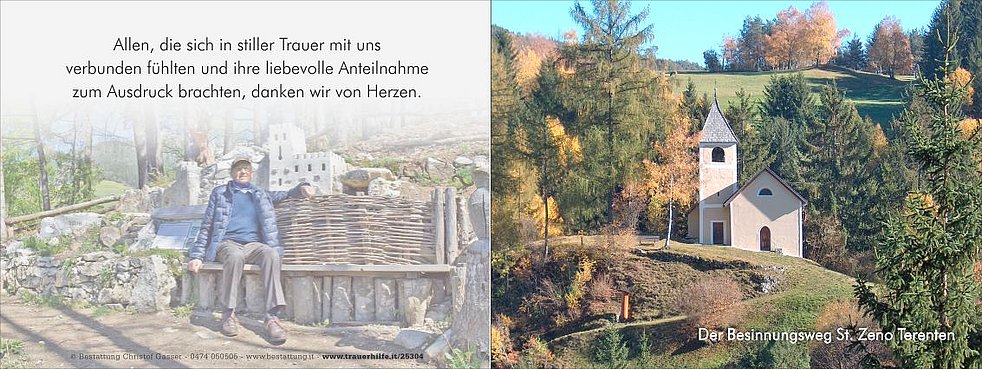 Gemeinsam begleiten wir unseren lieben Tata am Samstag, 18. Februar, um 14.45 Uhr vom Trauerhaus ausgehend, zum Abschiedsgottesdienst um 15 Uhr in die Pfarrkirche von Terenten.