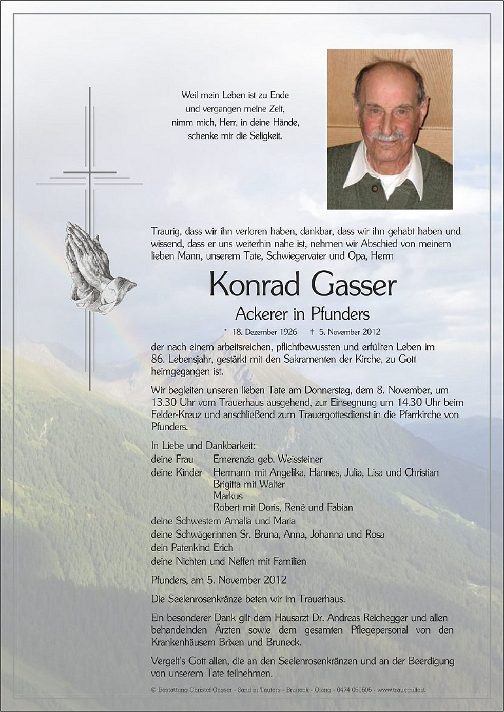 Wir begleiten unseren lieben Tate am Donnerstag, dem 8. November, um 13.30 Uhr vom Trauerhaus ausgehend, zur Einsegnung um 14.30 Uhr beim Felder-Kreuz und anschließend zum Trauergottesdienst in die Pfarrkirche von Pfunders.