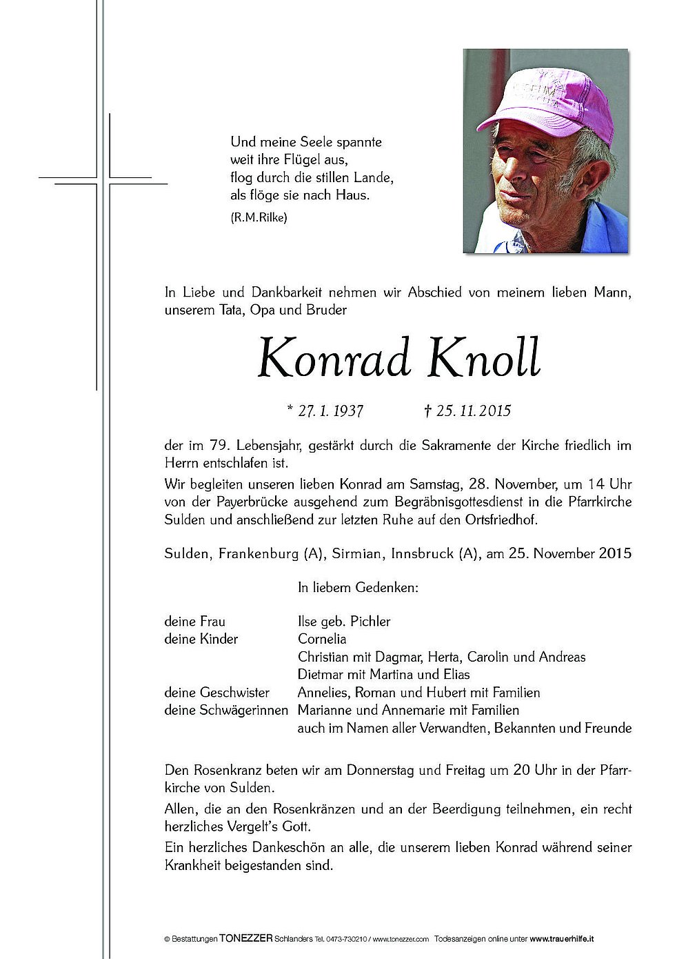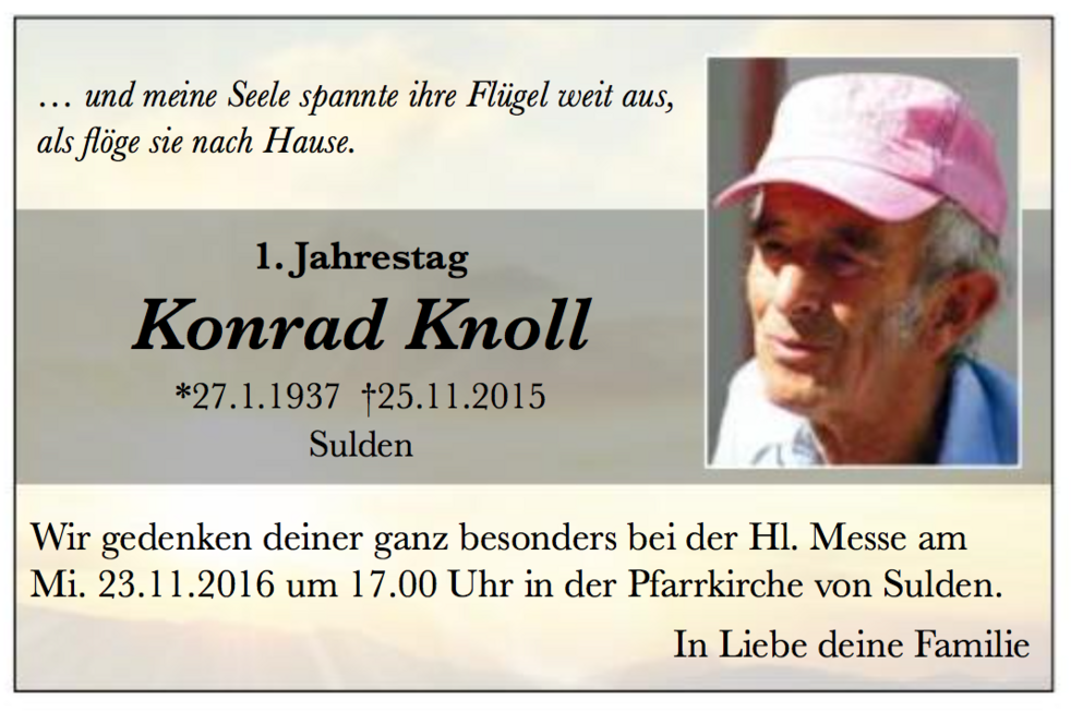 Wir begleiten unseren lieben Konrad am Samstag, 28. November, um 14 Uhr von der Payerbrücke ausgehend zum Begräbnisgottesdienst in die Pfarrkirche Sulden und anschließend zur letzten Ruhe auf den Ortsfriedhof.