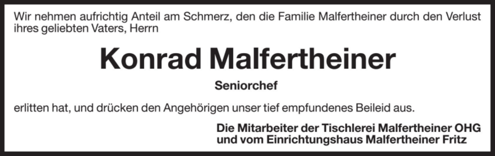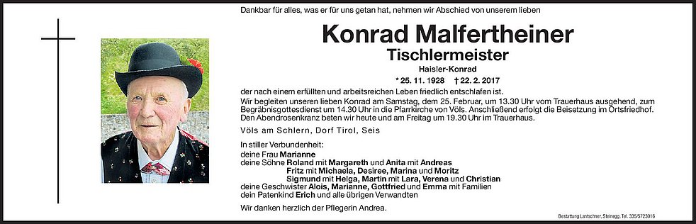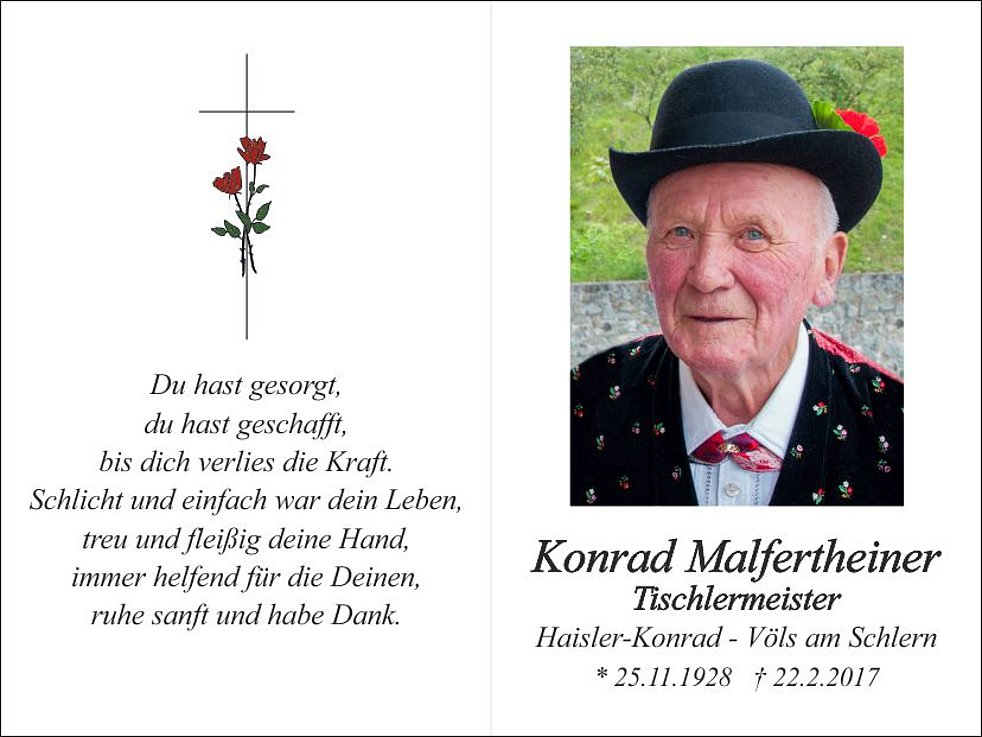 Wir begleiten unseren lieben Konrad am Samstag, 25. Februar, um 13.30 Uhr vom Trauerhaus ausgehend, zum Begräbnisgottesdienst um 14.30 Uhr in die Pfarrkirche von Völs.