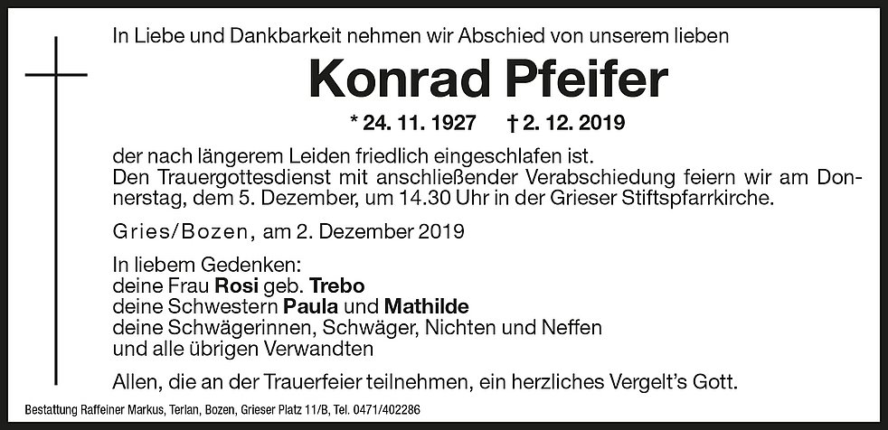 Den Trauergottesdienst mit anschließender Verabschiedung feiern wir am Donnerstag, dem 5. Dezember, um 14.30 Uhr in der Grieser Stiftspfarrkirche.