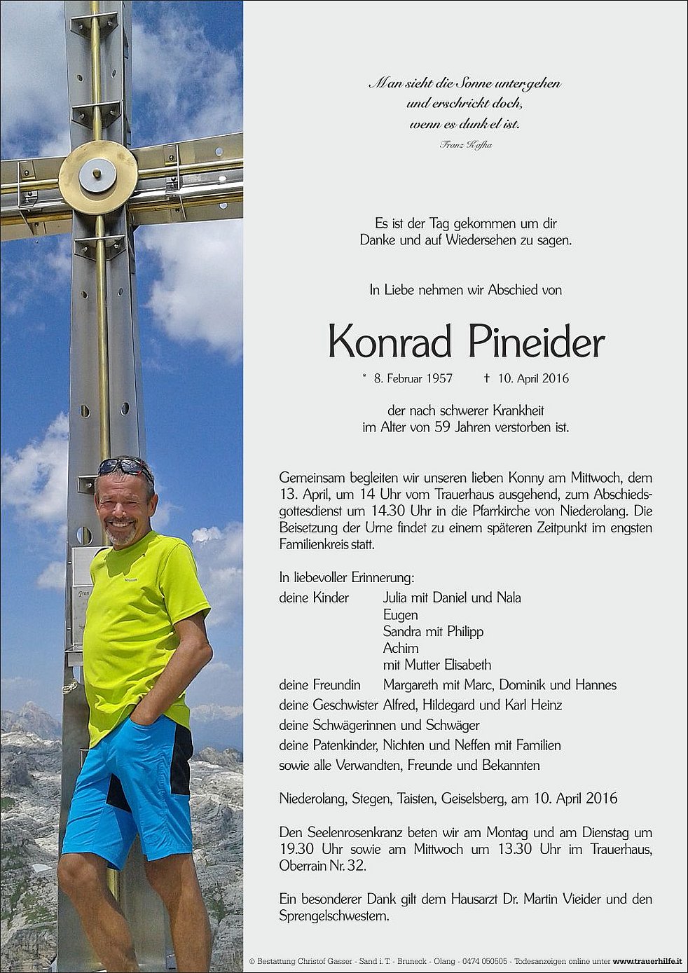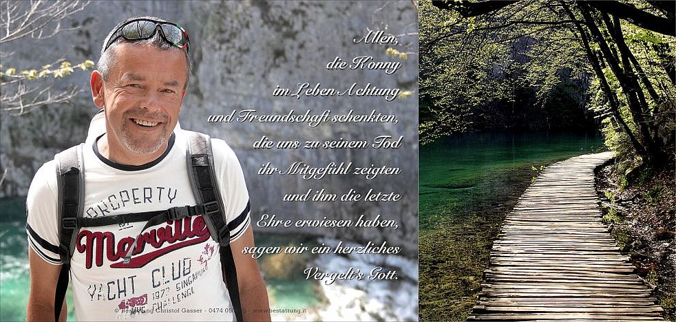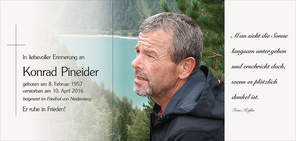 Gemeinsam begleiten wir unseren lieben Konny am Mittwoch, dem 13. April, um 14 Uhr vom Trauerhaus ausgehend, zum Abschieds-gottesdienst um 14.30 Uhr in die Pfarrkirche von Niederolang. Die Beisetzung der Urne findet zu einem späteren Zeitpunkt im engsten Familienkreis statt.