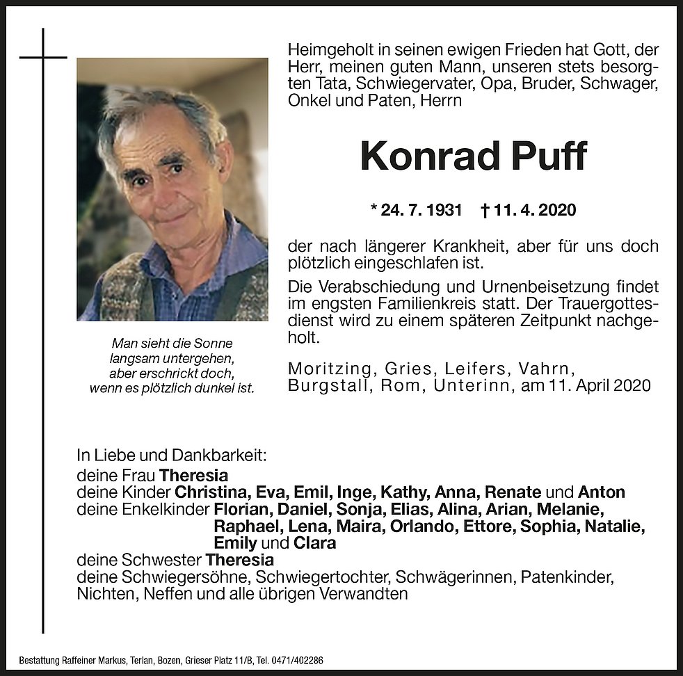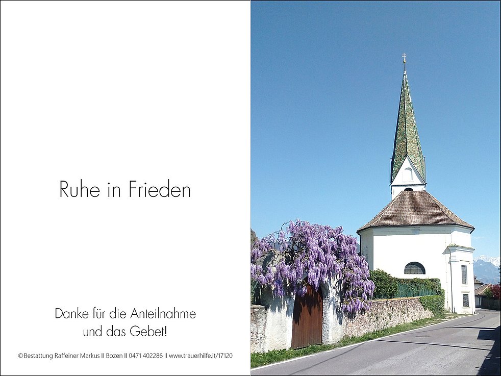 Heimgeholt in seinem ewigen Frieden hat Gott, der Herr, meinen guten Mann, unseren stets besorgten Tata, Schwiegervater, Opa, Bruder, Schwager, Onkel und Paten, Herrn