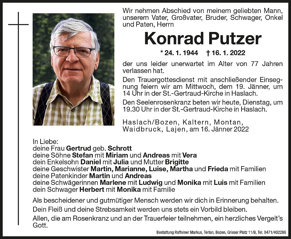 Den Trauergottesdienst mit anschlieβender Einsegnung feiern wir am Mittwoch, dem 19. Jänner, um 14 Uhr in der St. Gertraud-Kirche in Haslach.