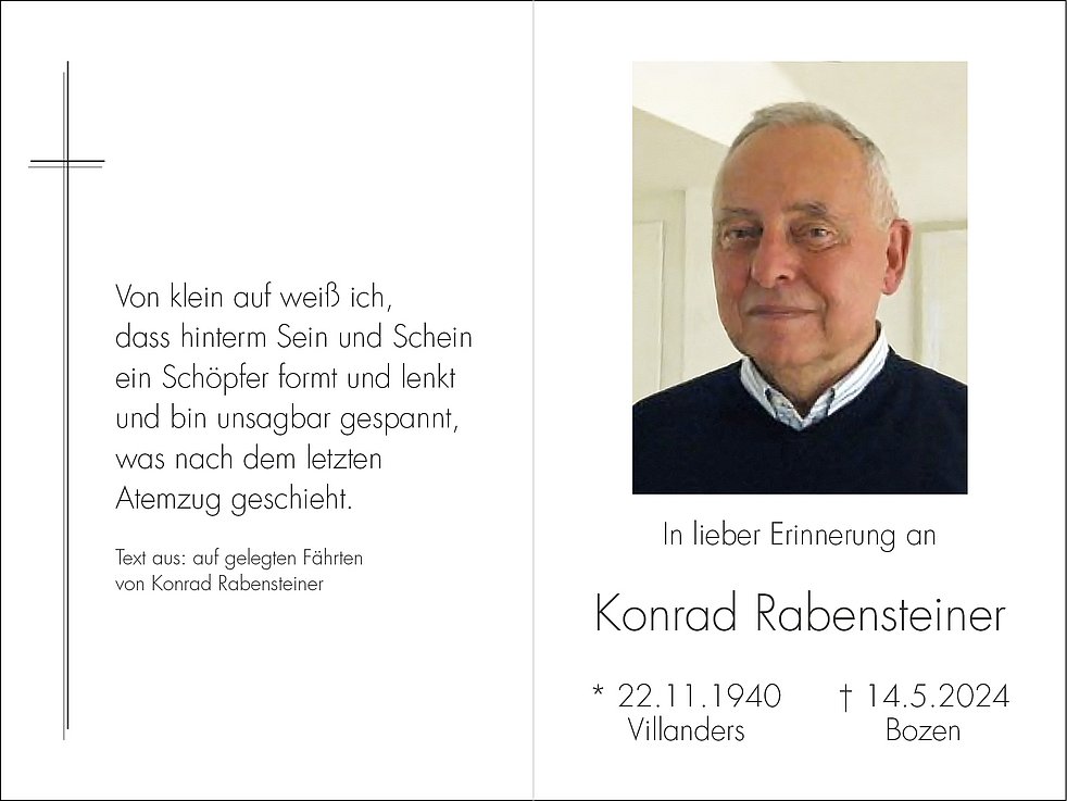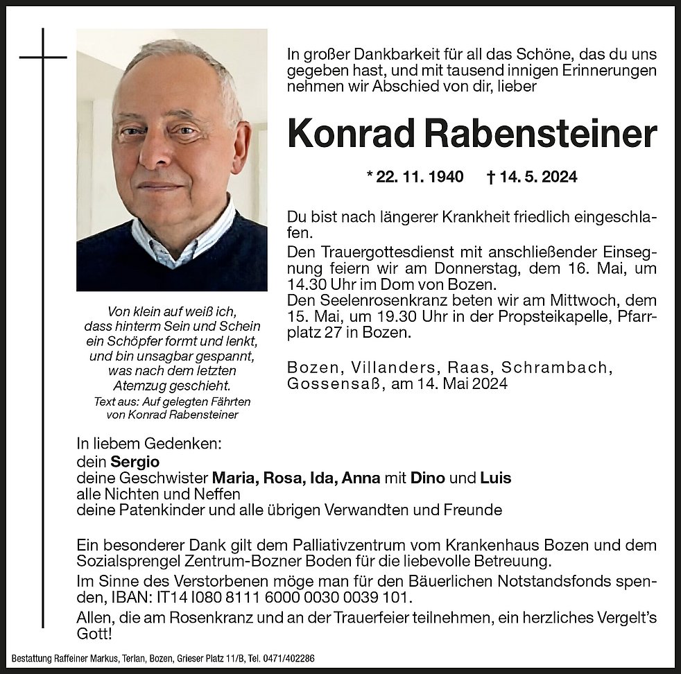 Den Trauergottesdienst mit anschließender Einsegnung feiern wir am Donnerstag, dem 16. Mai, um 14.30 Uhr im Dom von Bozen.