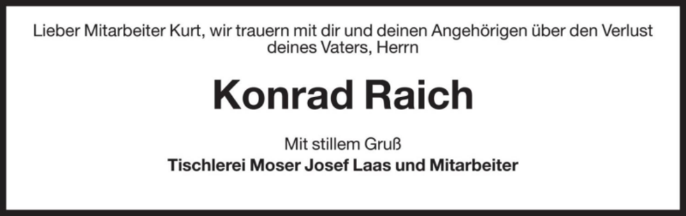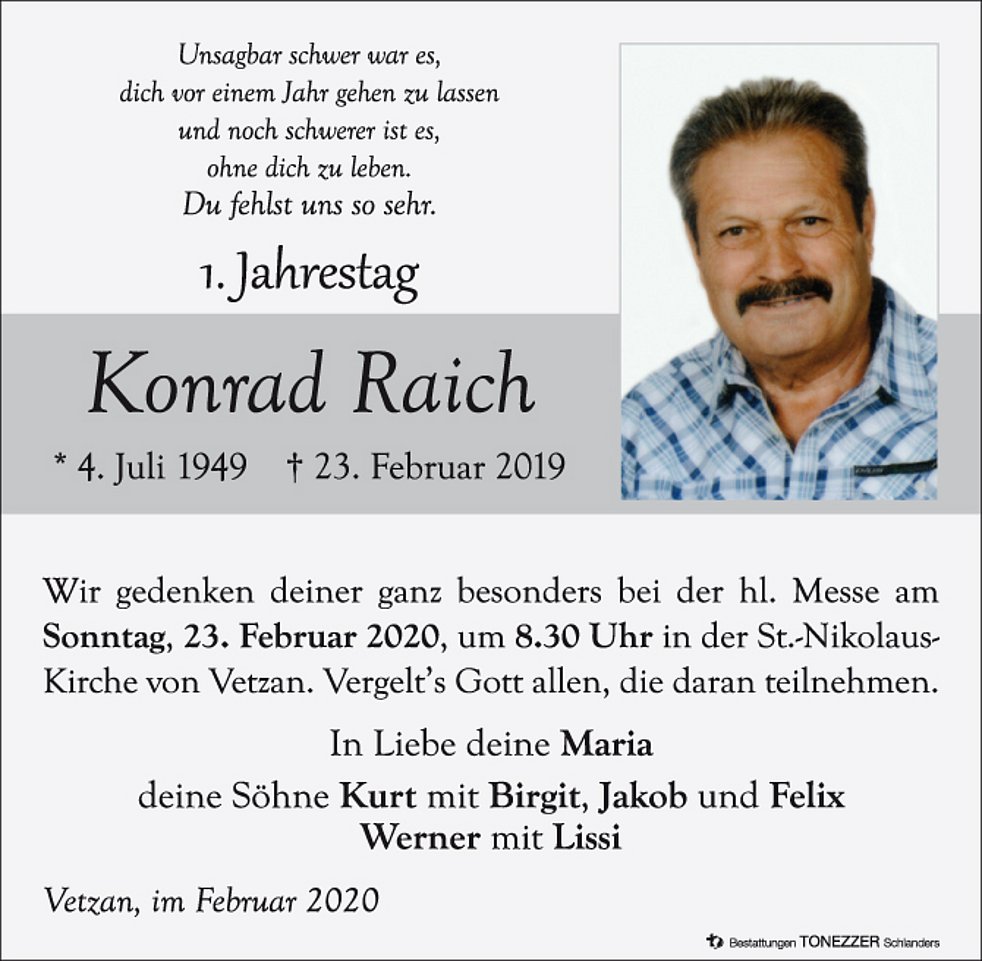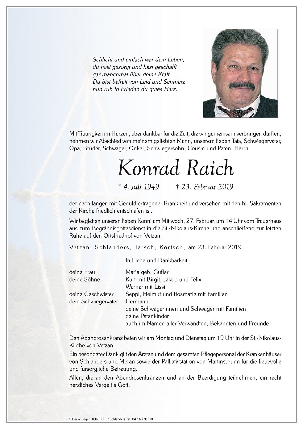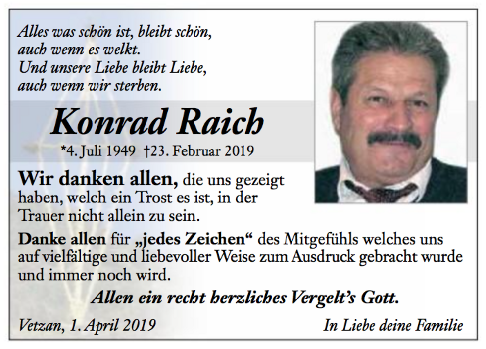 Wir begleiten unseren lieben Konni am Mittwoch, 27. Februar, um 14 Uhr vom Trauerhaus aus zum Begräbnisgottesdienst in die St.-Nikolaus-Kirche und anschließend zur letzten Ruhe auf den Ortsfriedhof von Vetzan.