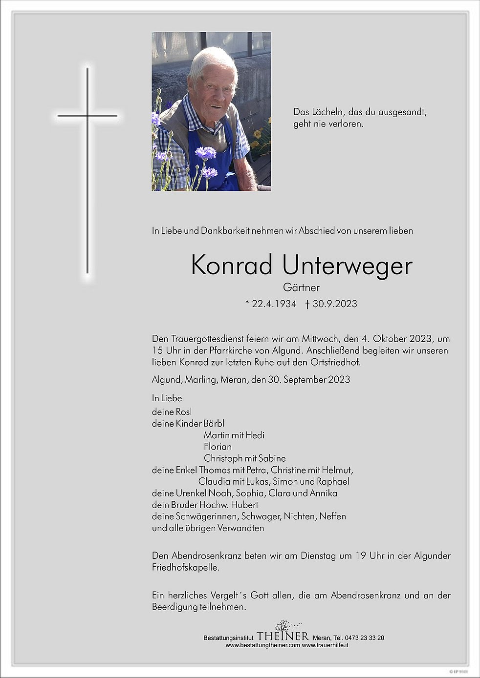 Den Trauergottesdienst feiern wir am Mittwoch, den 4. Oktober 2023, um 15 Uhr in der Pfarrkirche von Algund. Anschließend begleiten wir unseren lieben Konrad zur letzten Ruhe auf den Ortsfriedhof.