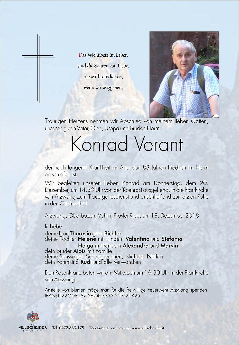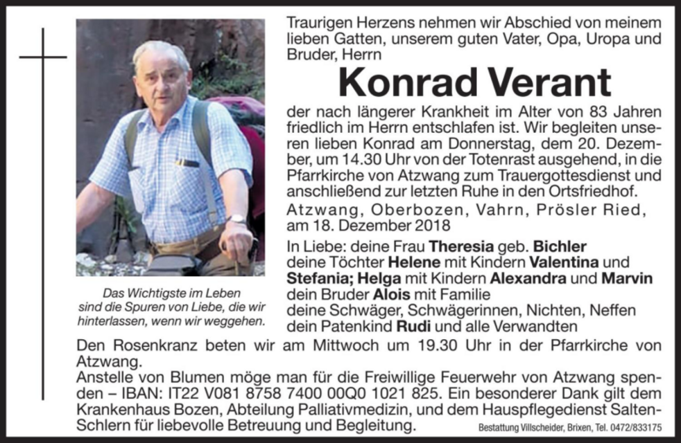 Begräbnisgottesdienst: 20.12. - 14:30 Uhr Atzwang