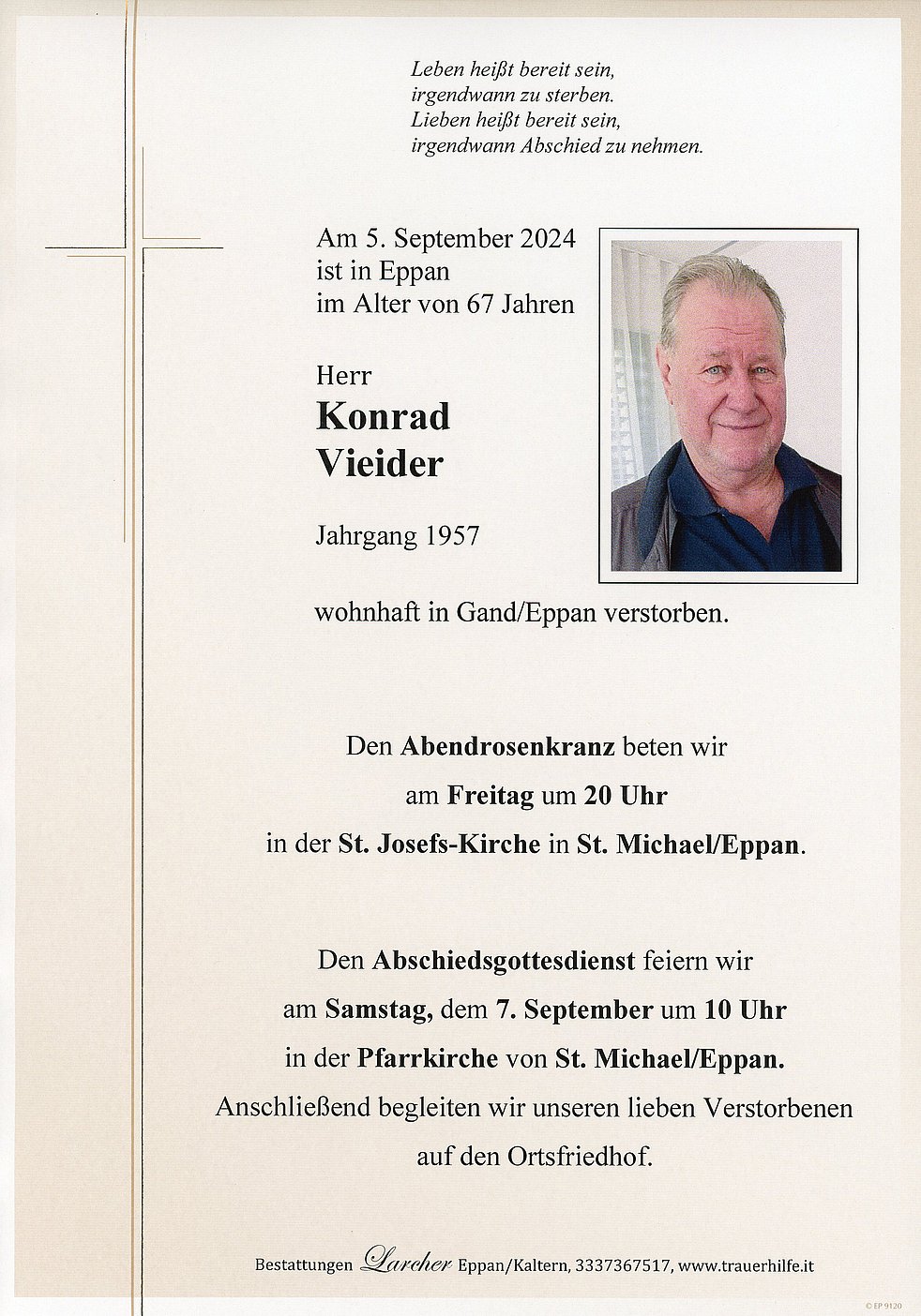 Den Abschiedsgottesdienst feiern wir am Samstag, dem 7. September um 10 Uhr in der Pfarrkirche von St. Michael/Eppan. Anschließend begleiten wir unseren lieben Verstorbenen auf den Ortsfriedhof.