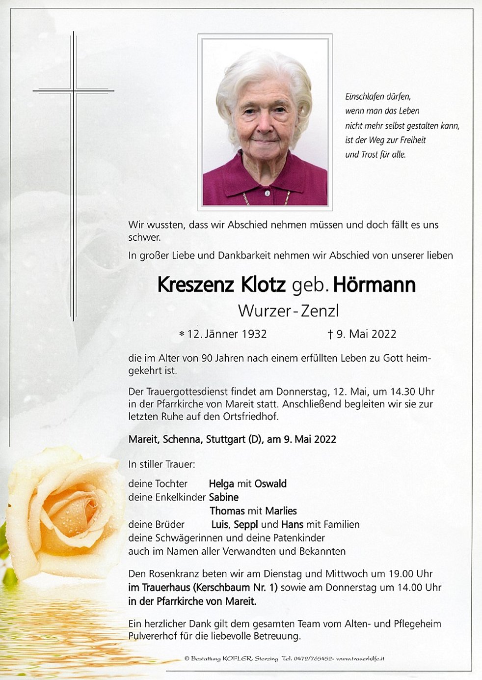 Der Trauergottesdienst findet am Donnerstag, 12. Mai, um 14.30 Uhr in der Pfarrkirche von Mareit statt. Anschließend begleiten wir sie zur letzten Ruhe auf den Ortsfriedhof.