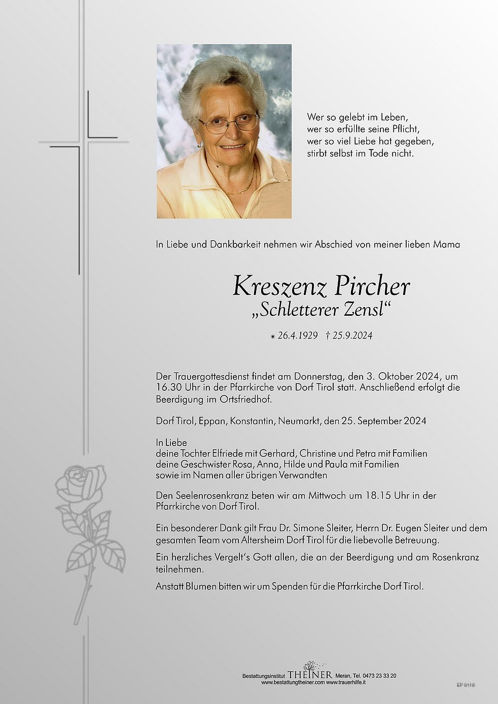 Der Trauergottesdienst findet am Donnerstag, den 3. Oktober 2024, um 16.30 Uhr in der Pfarrkirche von Dorf Tirol statt. Anschließend erfolgt die Beerdigung im Ortsfriedhof.
