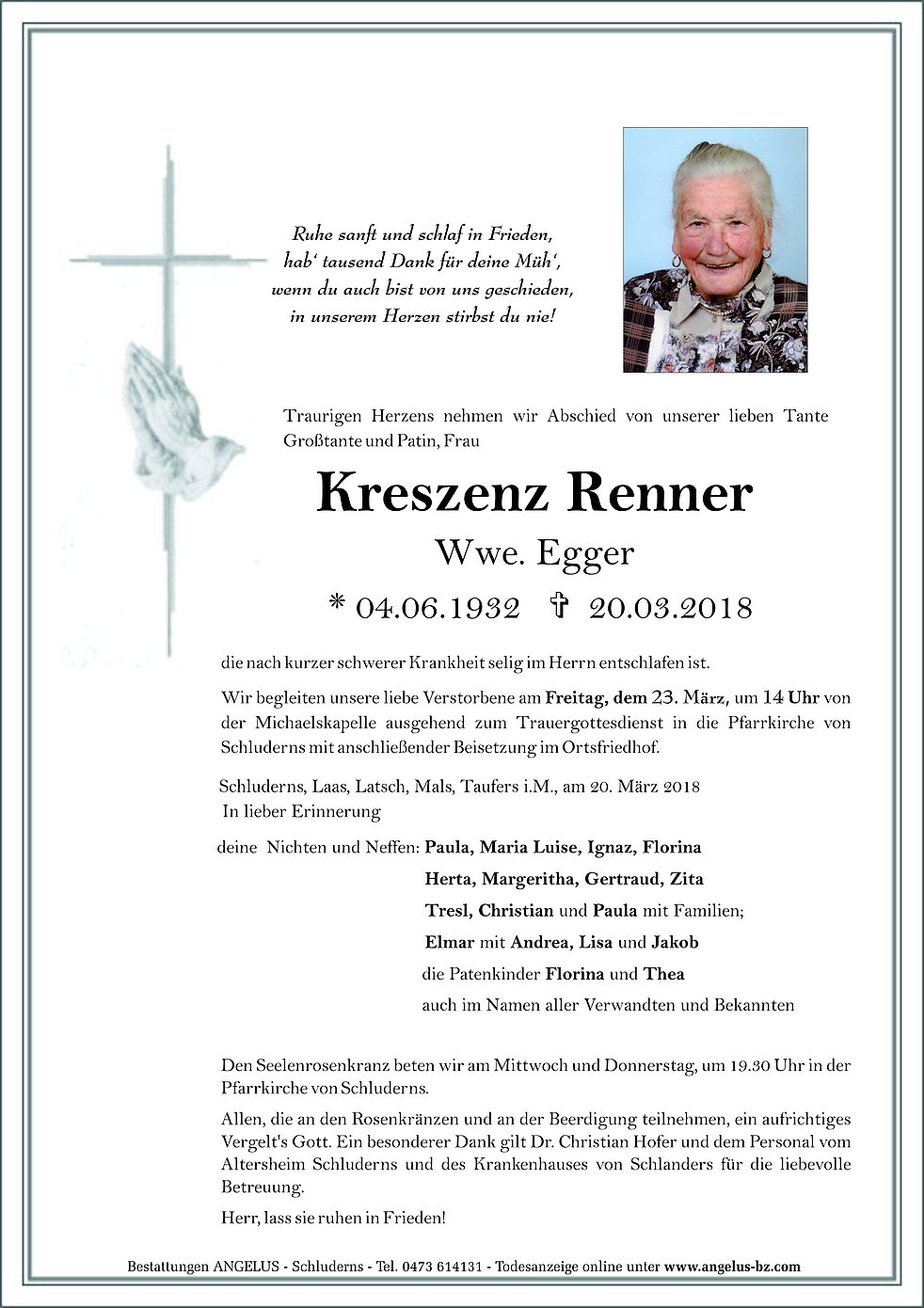 Wir begleiten unsere liebe Verstorbene am Freitag, dem 23. März, um 14 Uhr von der Michaelskapelle ausgehend zum Trauergottesdienst in die Pfarrkirche von Schluderns mit anschließender Beisetzung im Ortsfriedhof.