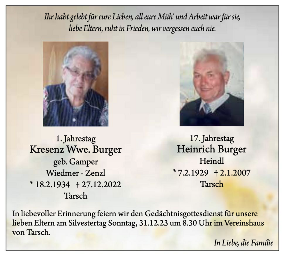 Am Freitag, 30. Dezember, um 13.40 Uhr beten wir den Rosenkranz; um 14 Uhr feiern wir den Begräbnisgottesdienst mit anschließender Verabschiedung in der Pfarrkirche von Tarsch.