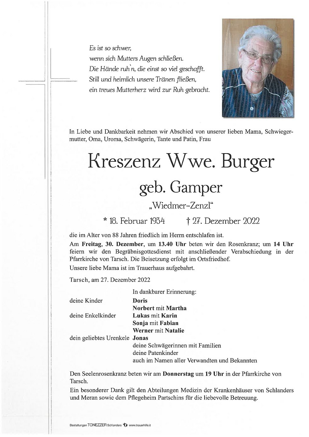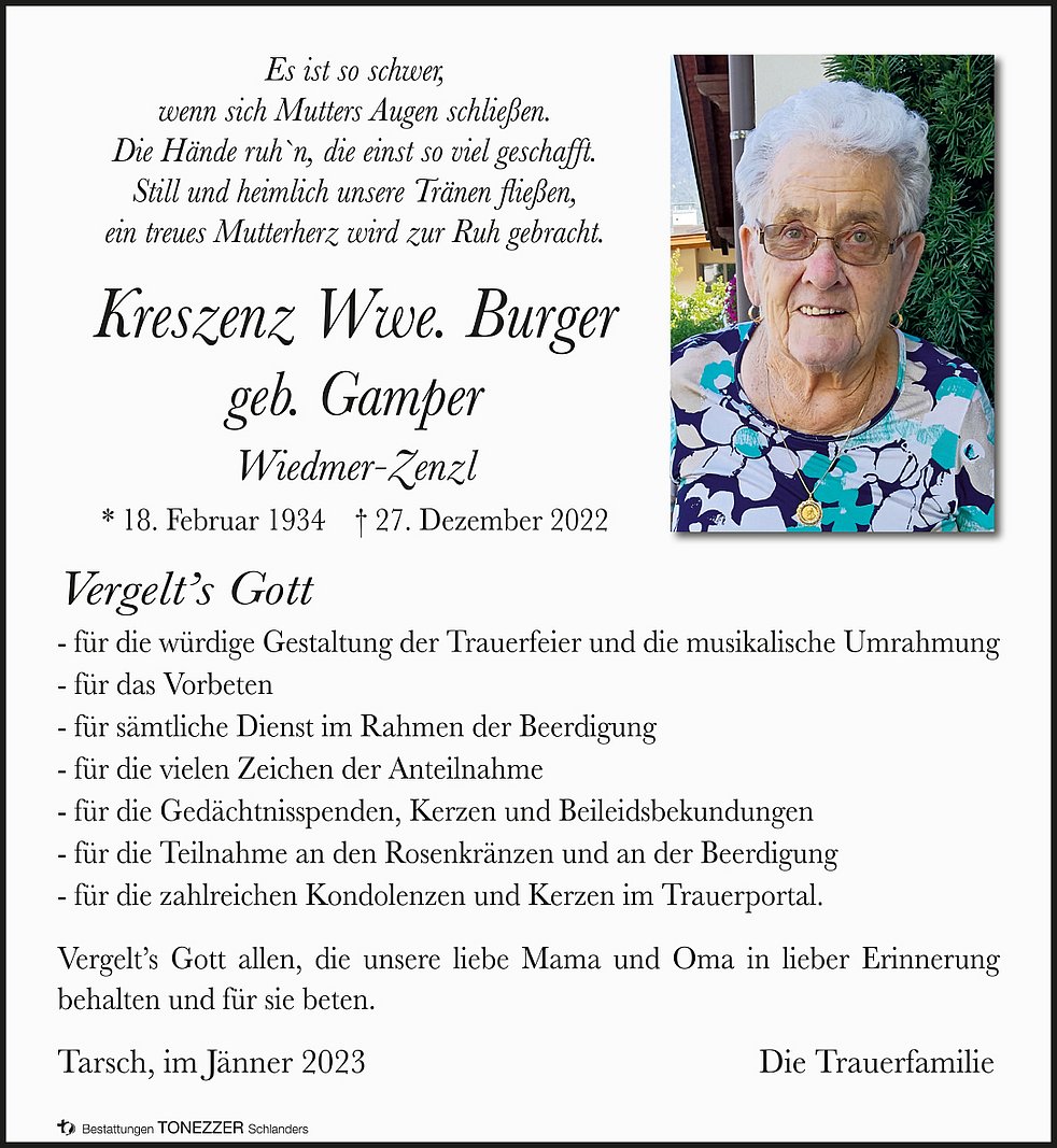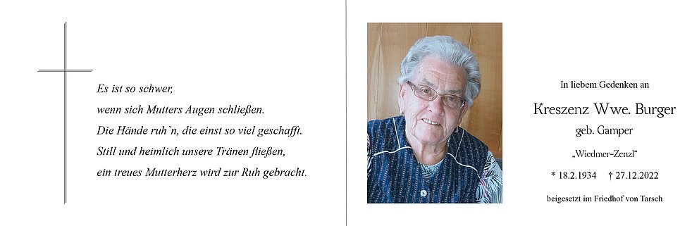 Die Beisetzung erfolgt im Ortsfriedhof. Unsere liebe Mama ist im Trauerhaus aufgebahrt.