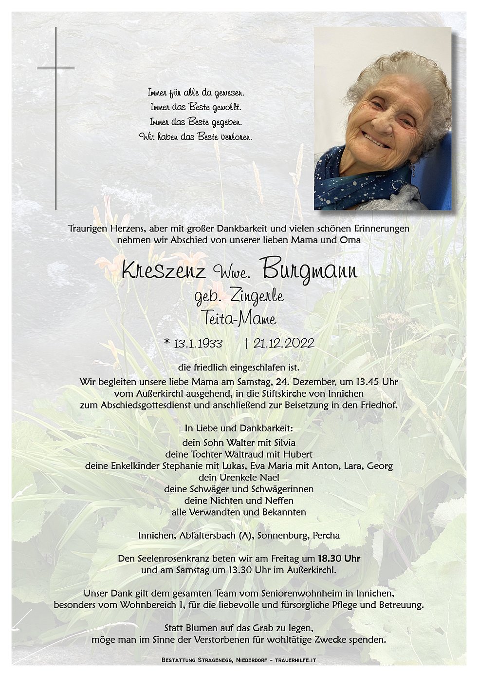 Wir begleiten unsere liebe Mama am Samstag, 24. Dezember, um 13.45 Uhr vom Außerkirchl ausgehend, in die Stiftskirche von Innichen zum Abschiedsgottesdienst und anschließend zur Beisetzung in den Friedhof.
