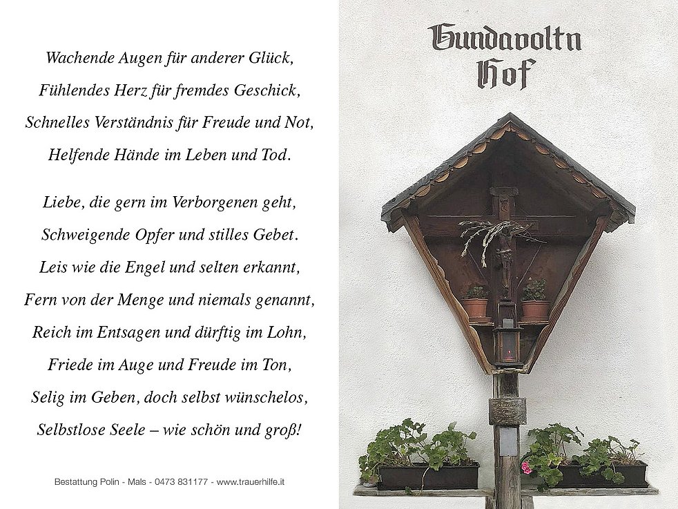 Was du im Leben hast gegeben, dafür ist jeder Dank zu klein.