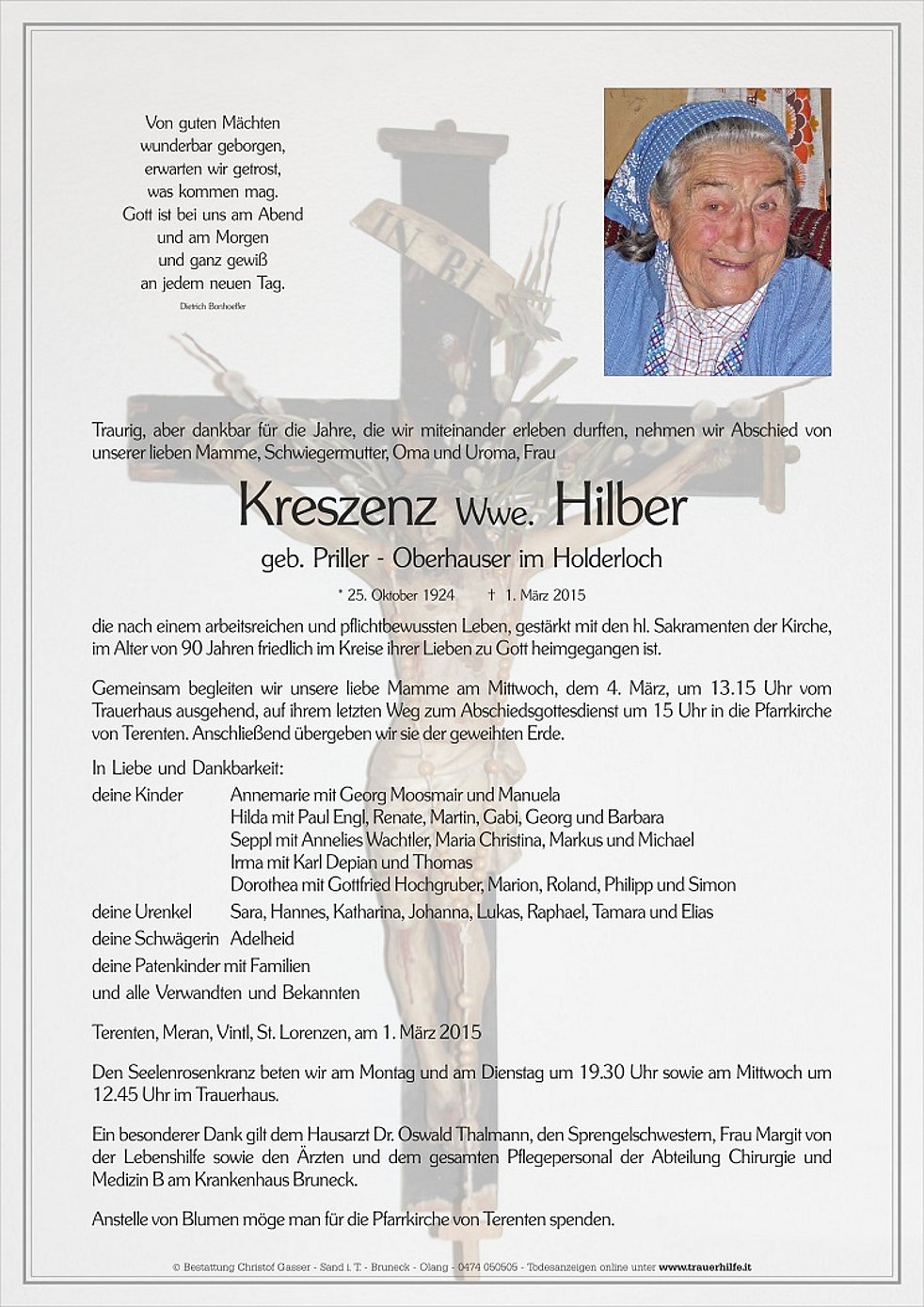 Gemeinsam begleiten wir unsere liebe Mamme am Mittwoch, dem 4. März, um 13.15 Uhr vom Trauerhaus ausgehend, auf ihrem letzten Weg zum Abschiedsgottesdienst um 15 Uhr in die Pfarrkirche von Terenten. Anschließend übergeben wir sie der geweihten Erde.