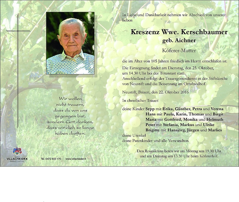 die im Alter von 105 Jahren friedlich im Herrn entschlafen ist.