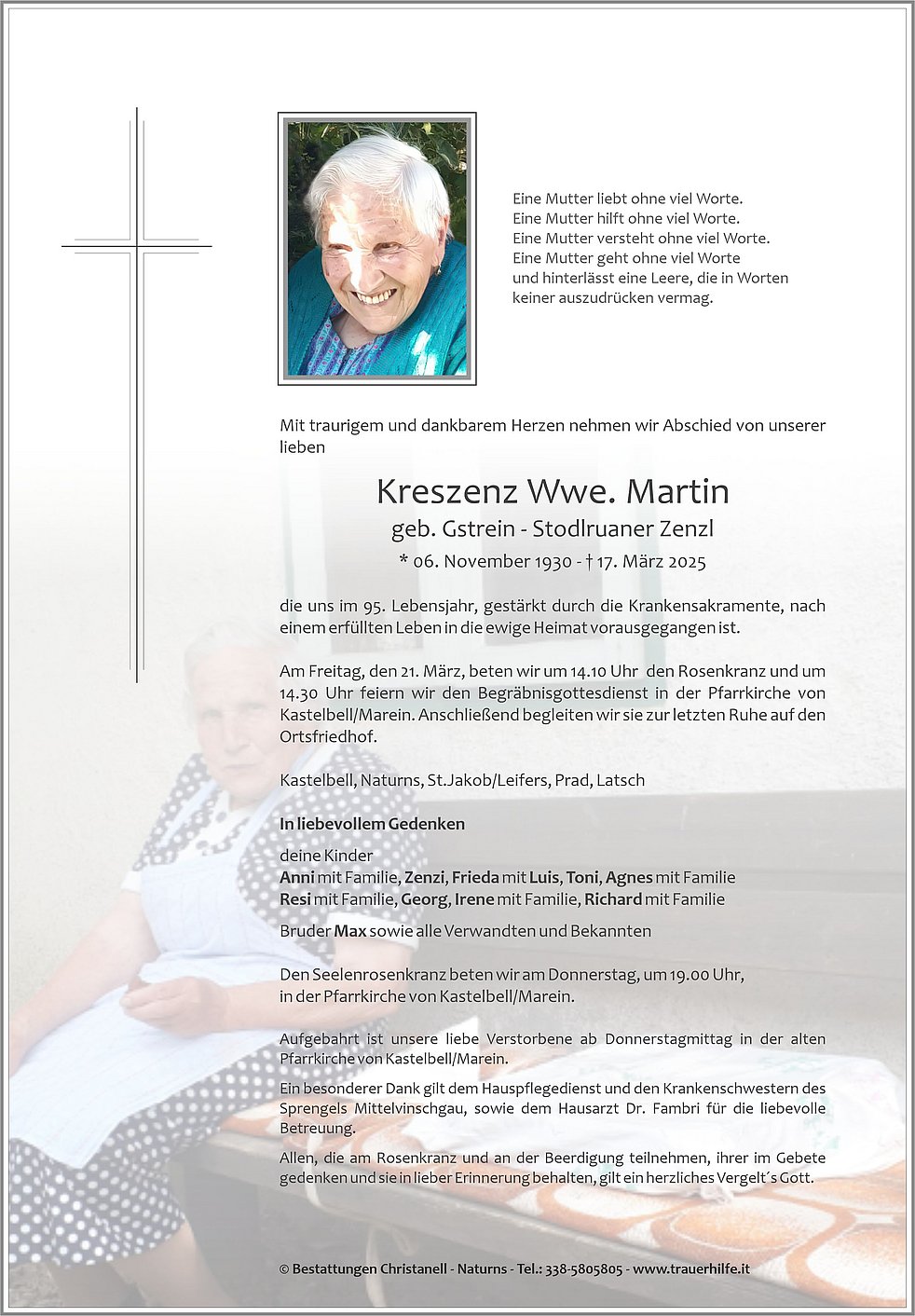 Am Freitag, den 21. März, beten wir um 14.10 Uhr den Rosenkranz und um 14.30 Uhr feiern wir den Begräbnisgottesdienst in der Pfarrkirche von Kastelbell/Marein. Anschließend begleiten wir sie zur letzten Ruhe auf den Ortsfriedhof.