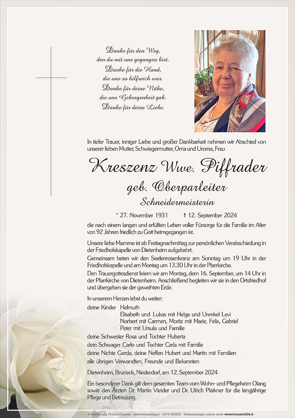 Ein besonderer Dank gilt dem gesamten Team vom Wohn- und Pflegeheim Olang sowie den Ärzten Dr. Martin Vieider und Dr. Ulrich Plaikner für die langjährige Pflege und Betreuung.