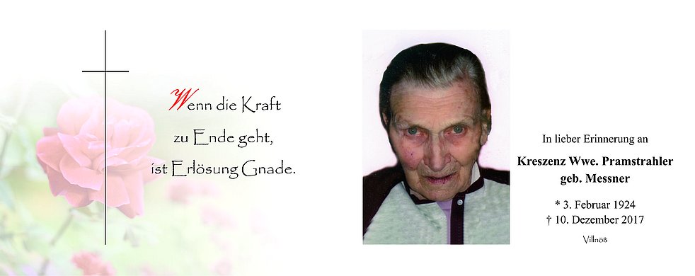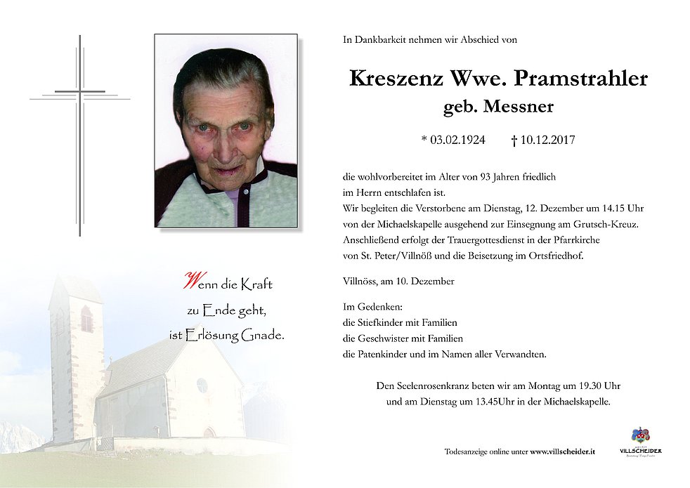 Wir begleiten die Verstorbene am Dienstag, 12. Dezember um 14.15 Uhr von der Michaelskapelle ausgehend zur Einsegnung am Grutsch-Kreuz. Anschließend erfolgt der Trauergottesdienst in der Pfarrkirche