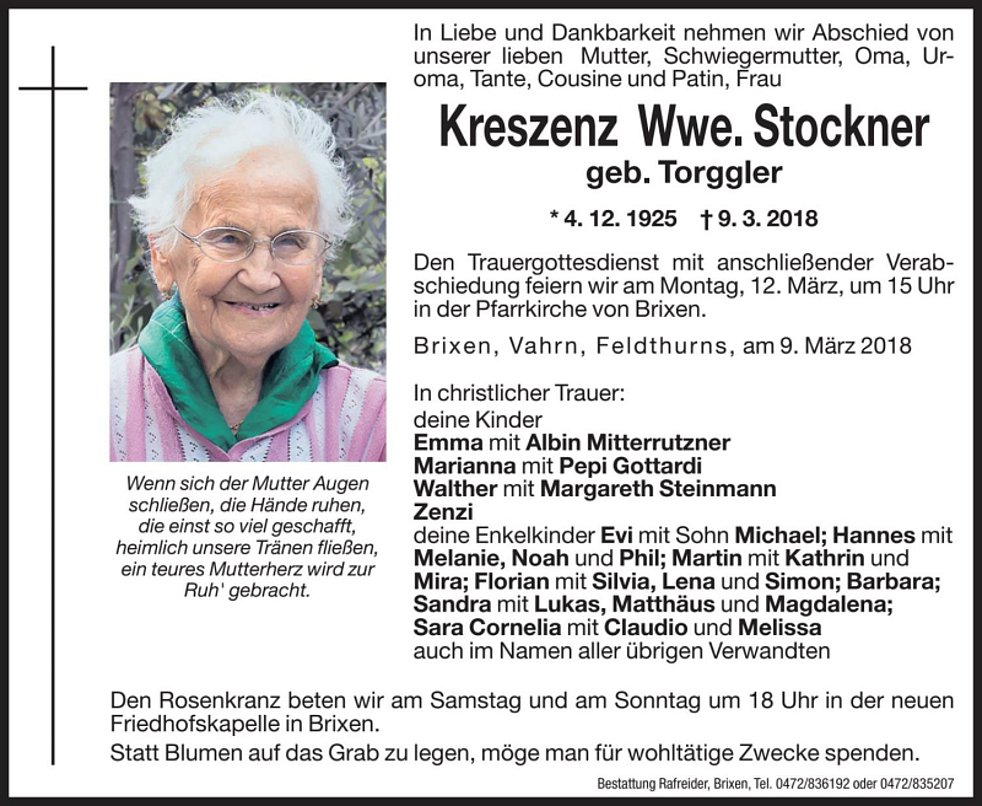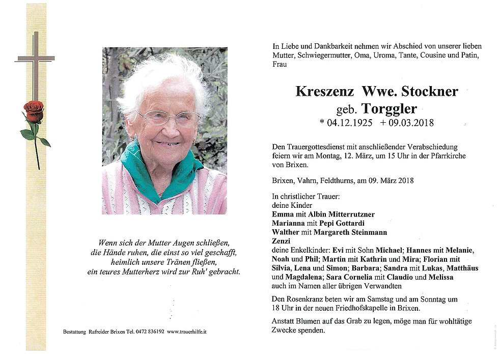 Den Trauergottesdienst mit anschließender Verabschiedung feiern wir am Montag, 12. März, um 15 Uhr in der Pfarrkirche von Brixen.