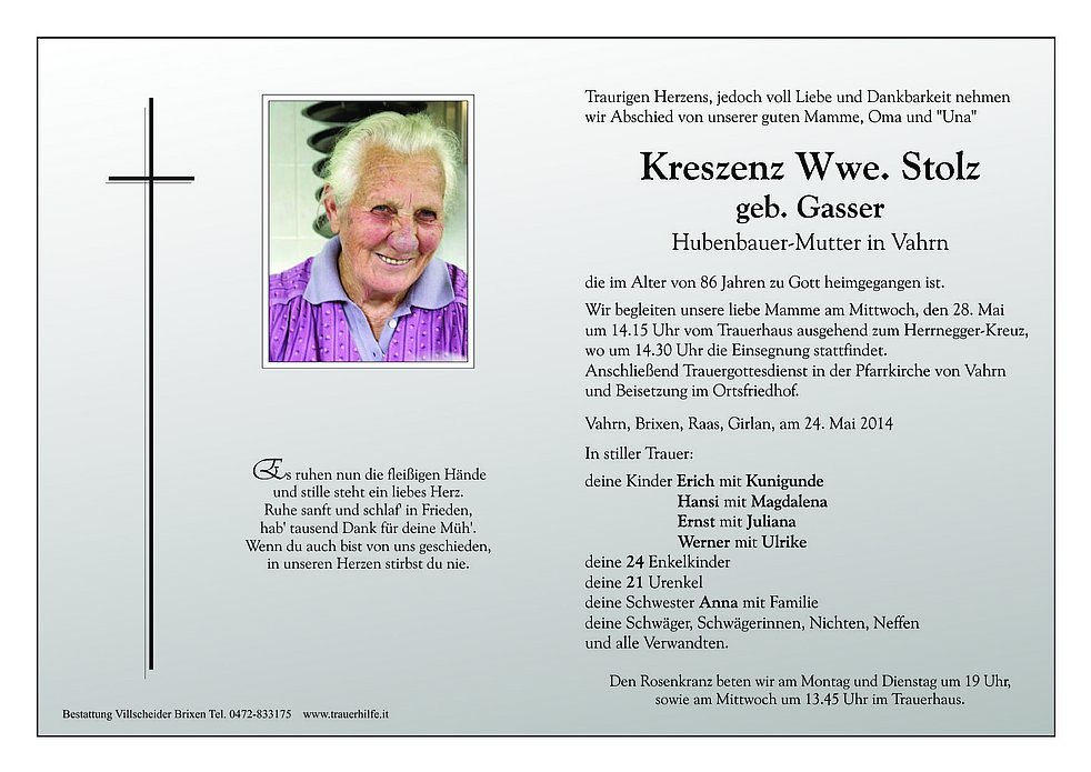 Anschließend Trauergottesdienst in der Pfarrkirche von Vahrn und Beisetzung im Ortsfriedhof.