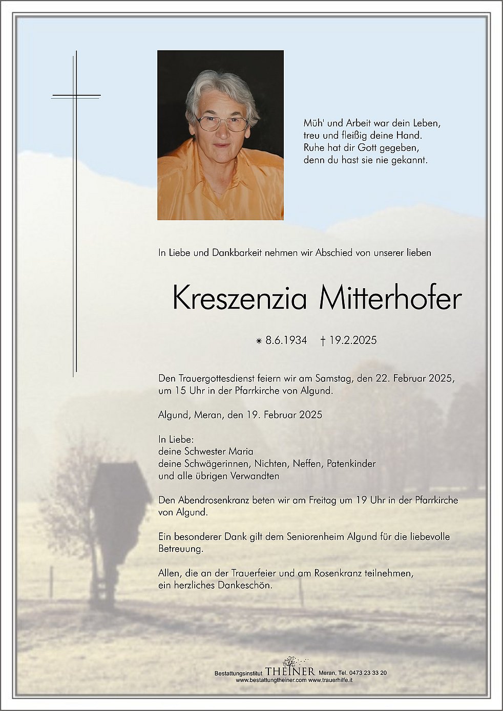Den Trauergottesdienst feiern wir am Samstag, den 22. Februar 2025, um 15 Uhr in der Pfarrkirche von Algund.