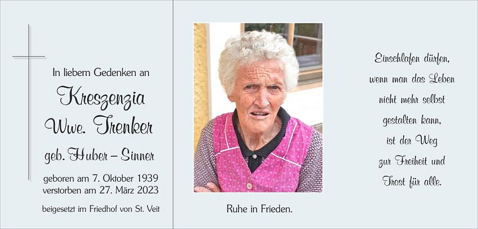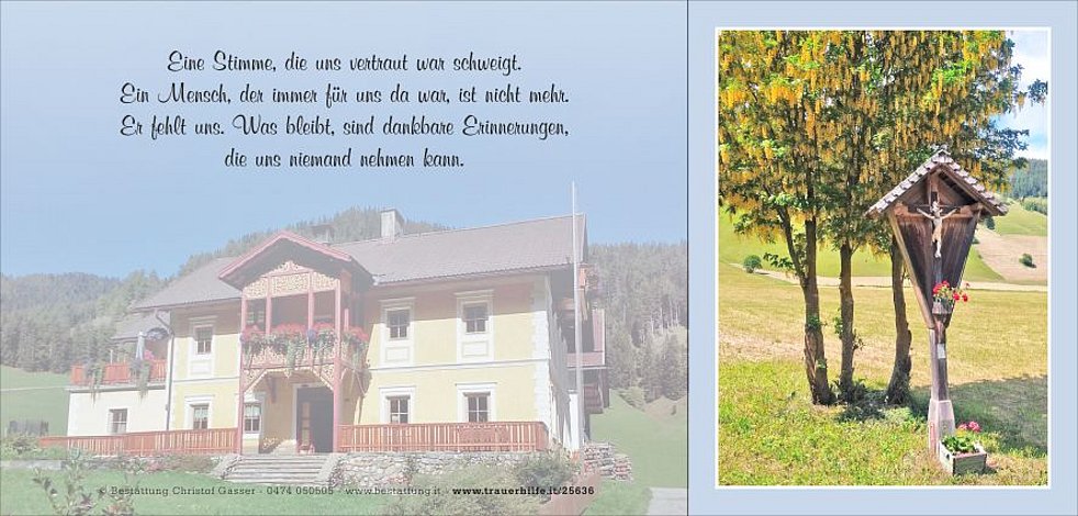 Wir begleiten unsere liebe Mamme am Donnerstag, dem 30. März, um 13.30 Uhr vom Trauerhaus ausgehend, zum Abschiedesgottesdienst um 14 Uhr in die Pfarrkirche von St. Veit.