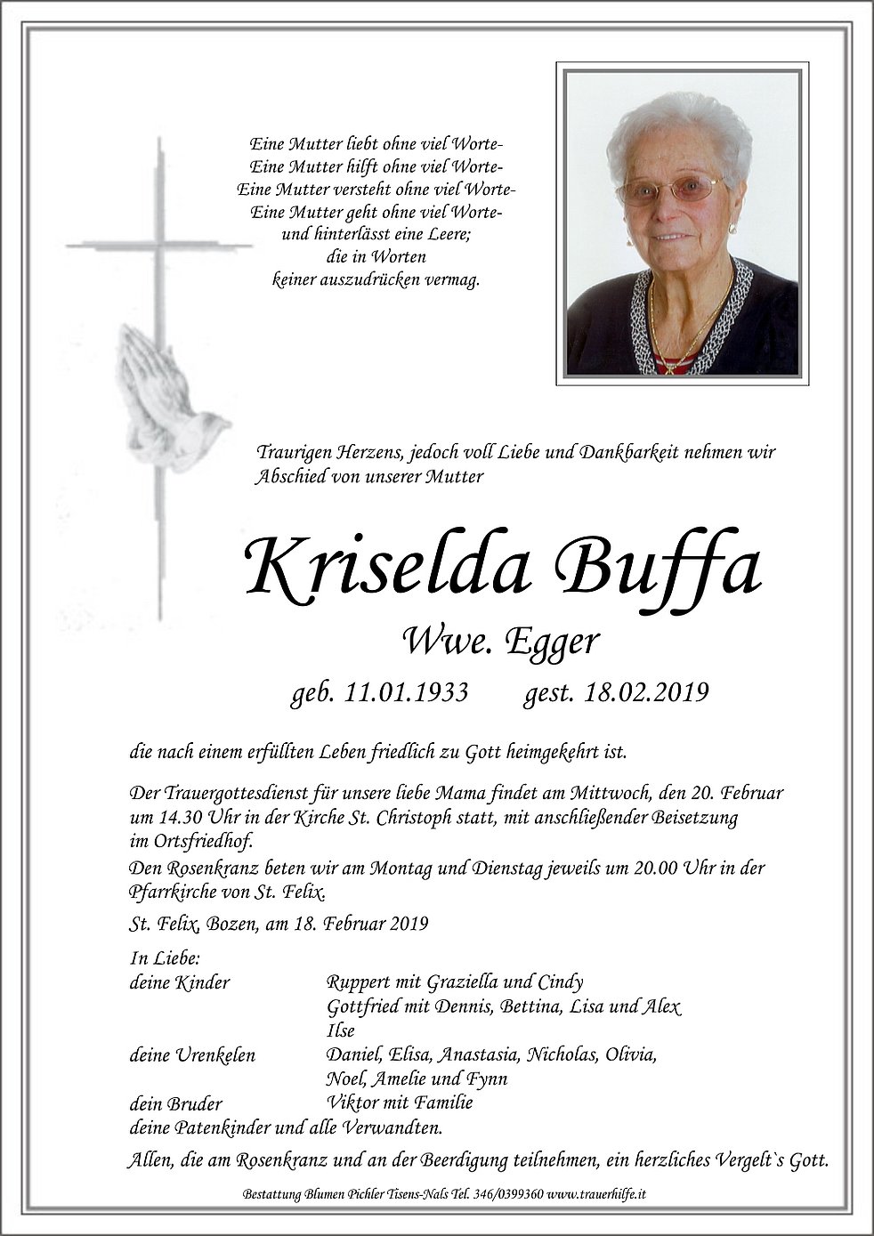 Der Trauergottesdienst für unsere liebe Mama findet am Mittwoch, den 20. Februar