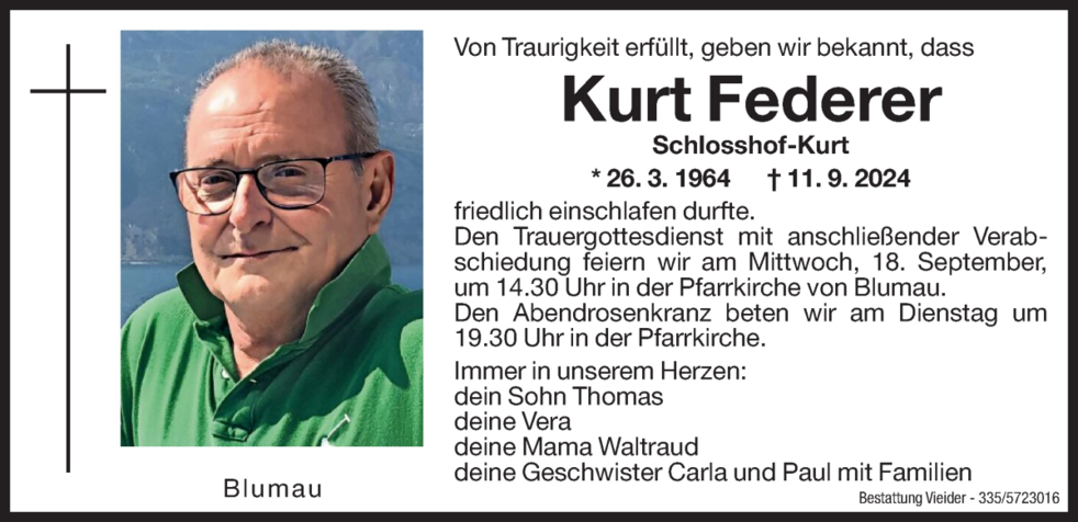 Den Trauergottesdienst mit anschließender Verabschiedung feiern wir am Mittwoch, 18. September, um 14.30 Uhr in der Pfarrkirche von Blumau.