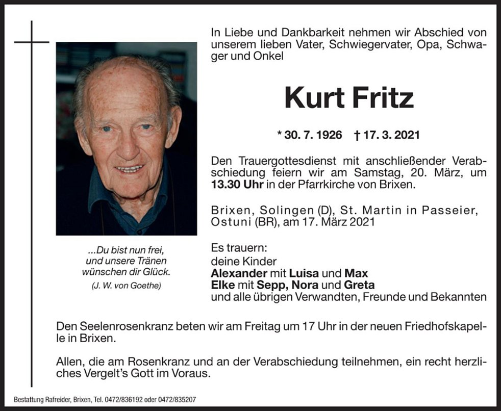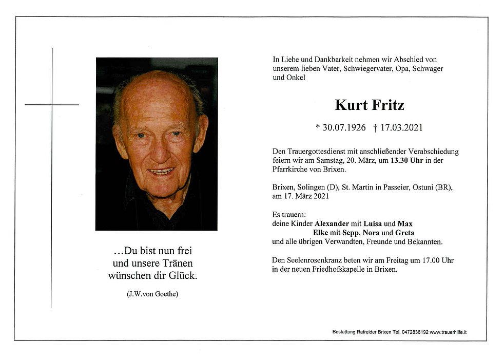 Den Trauergottesdienst mit anschließender Verabschiedung feiern wir am Samstag, 20. März, um 13.30 Uhr in der Pfarrkirche von Brixen.