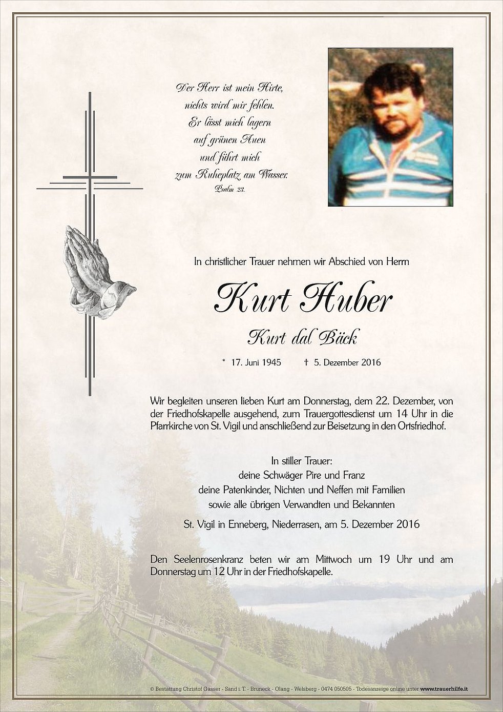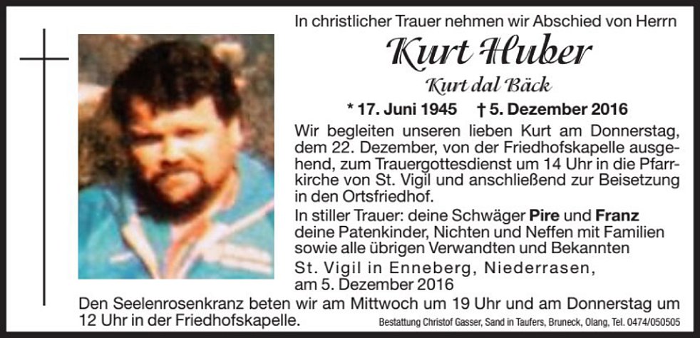 Wir begleiten unseren lieben Kurt am Donnerstag, dem 22. Dezember, von der Friedhofskapelle ausgehend, zum Trauergottesdienst um 14 Uhr in die Pfarrkirche von St. Vigil und anschließend zur Beisetzung in den Ortsfriedhof.