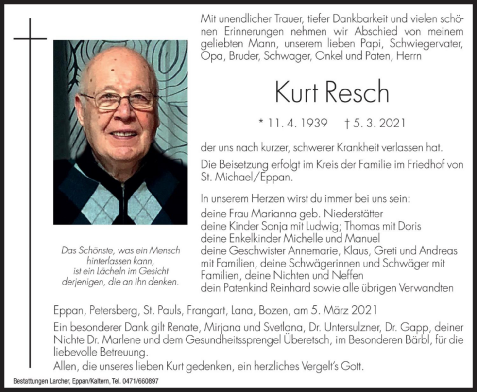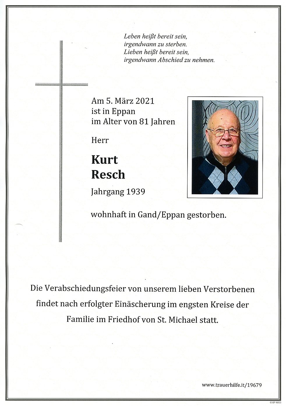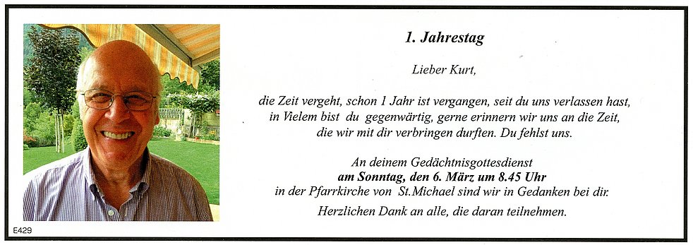 Jahresgottesdienst: 06.03. - 08:45 Uhr Pfarrkirche St. Michael/Eppan