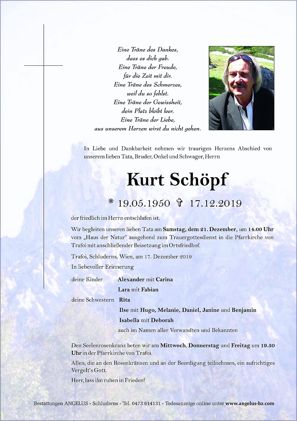 Wir begleiten unseren lieben Tata am Samstag, dem 21. Dezember, um 14.00 Uhr vom „Haus der Natur“ ausgehend zum Trauergottesdienst in die Pfarrkirche von Trafoi mit anschließender Beisetzung im Ortsfriedhof.