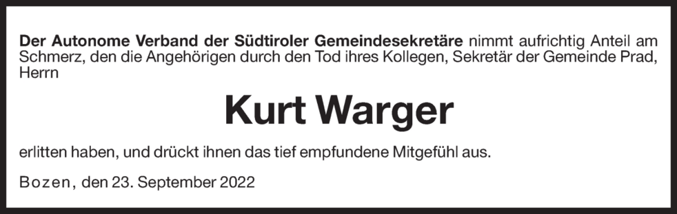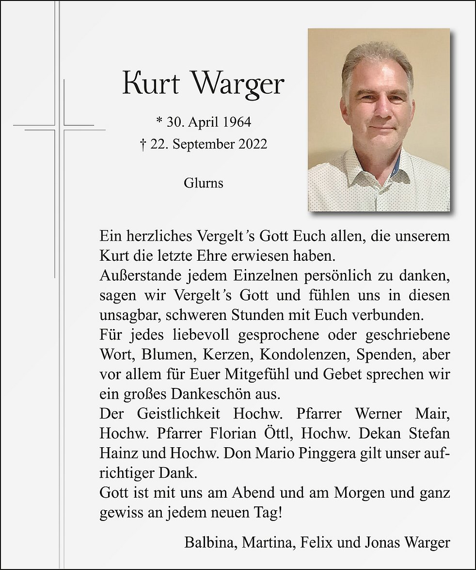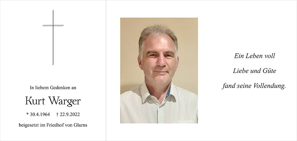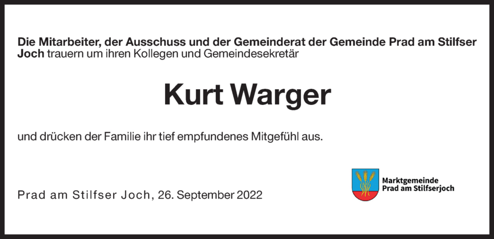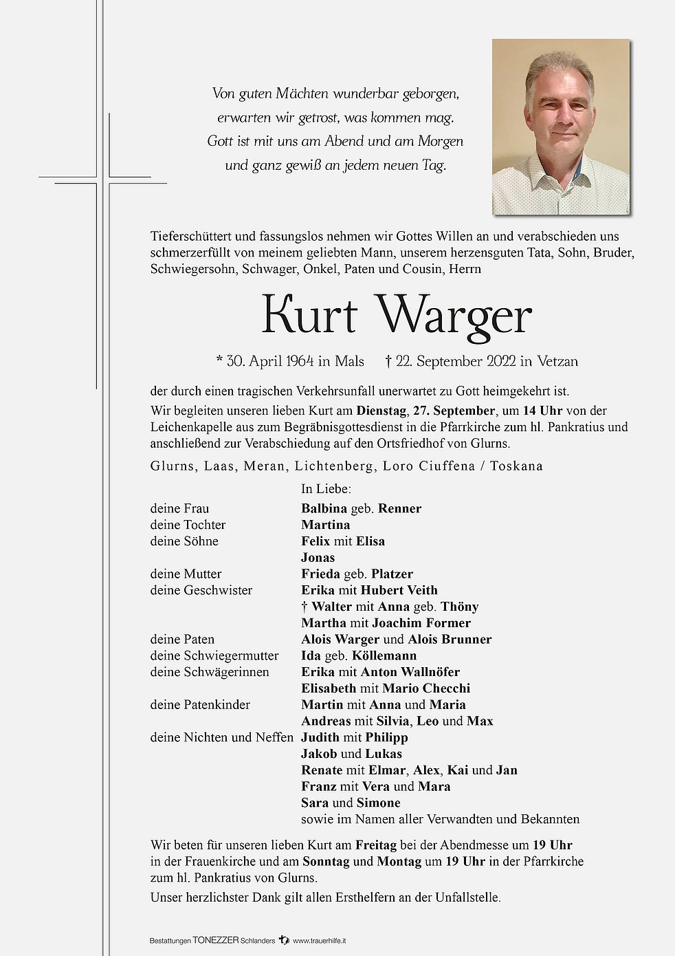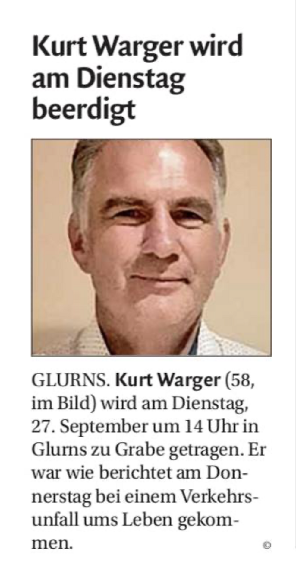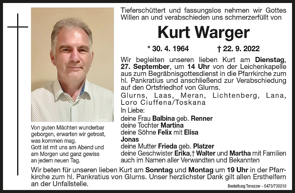 Wir begleiten unseren lieben Kurt am Dienstag, 27. September, um 14 Uhr von der Leichenkapelle aus zum Begräbnisgottesdienst in die Pfarrkirche zum hl. Pankratius und anschließend zur Verabschiedung auf den Ortsfriedhof von Glurns.