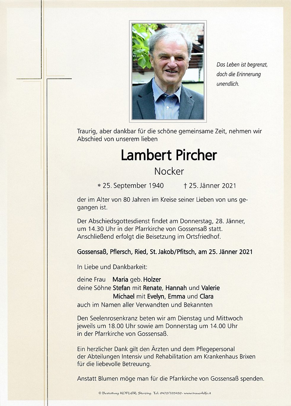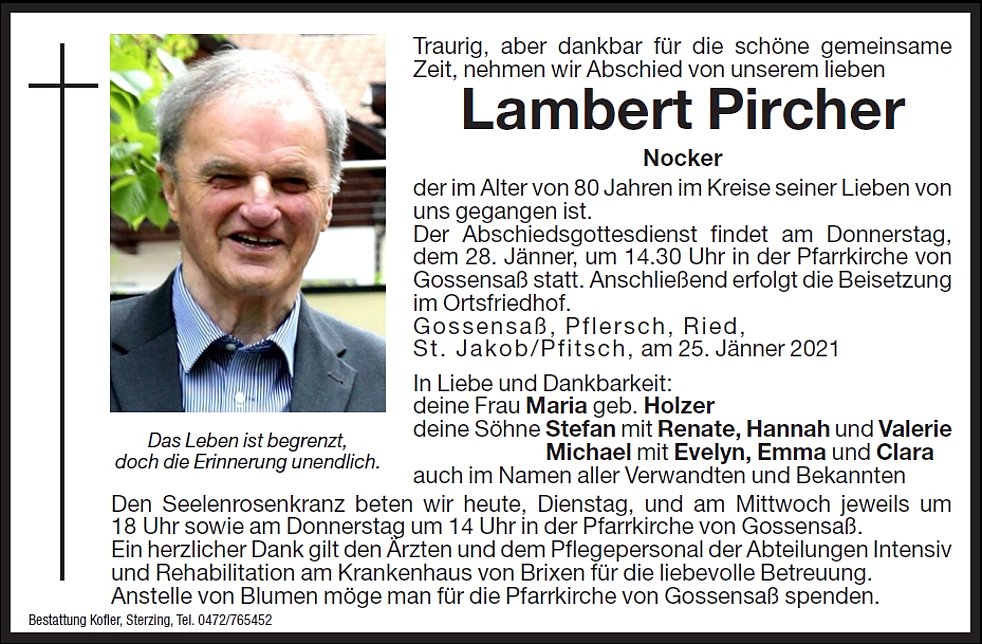 Der Abschiedsgottesdienst findet am Donnerstag, 28. Jänner, um 14.30 Uhr in der Pfarrkirche von Gossensaß statt. Anschließend erfolgt die Beisetzung im Ortsfriedhof.