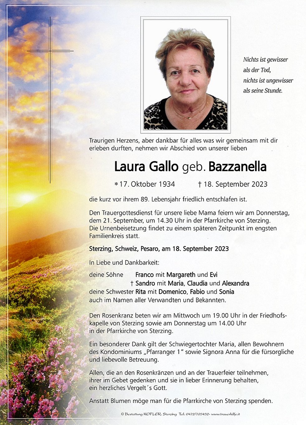 Den Trauergottesdienst für unsere liebe Mama feiern wir am Donnerstag, dem 21. September, um 14.30 Uhr in der Pfarrkirche von Sterzing. Die Urnenbeisetzung findet zu einem späteren Zeitpunkt im engsten Familienkreis statt.
