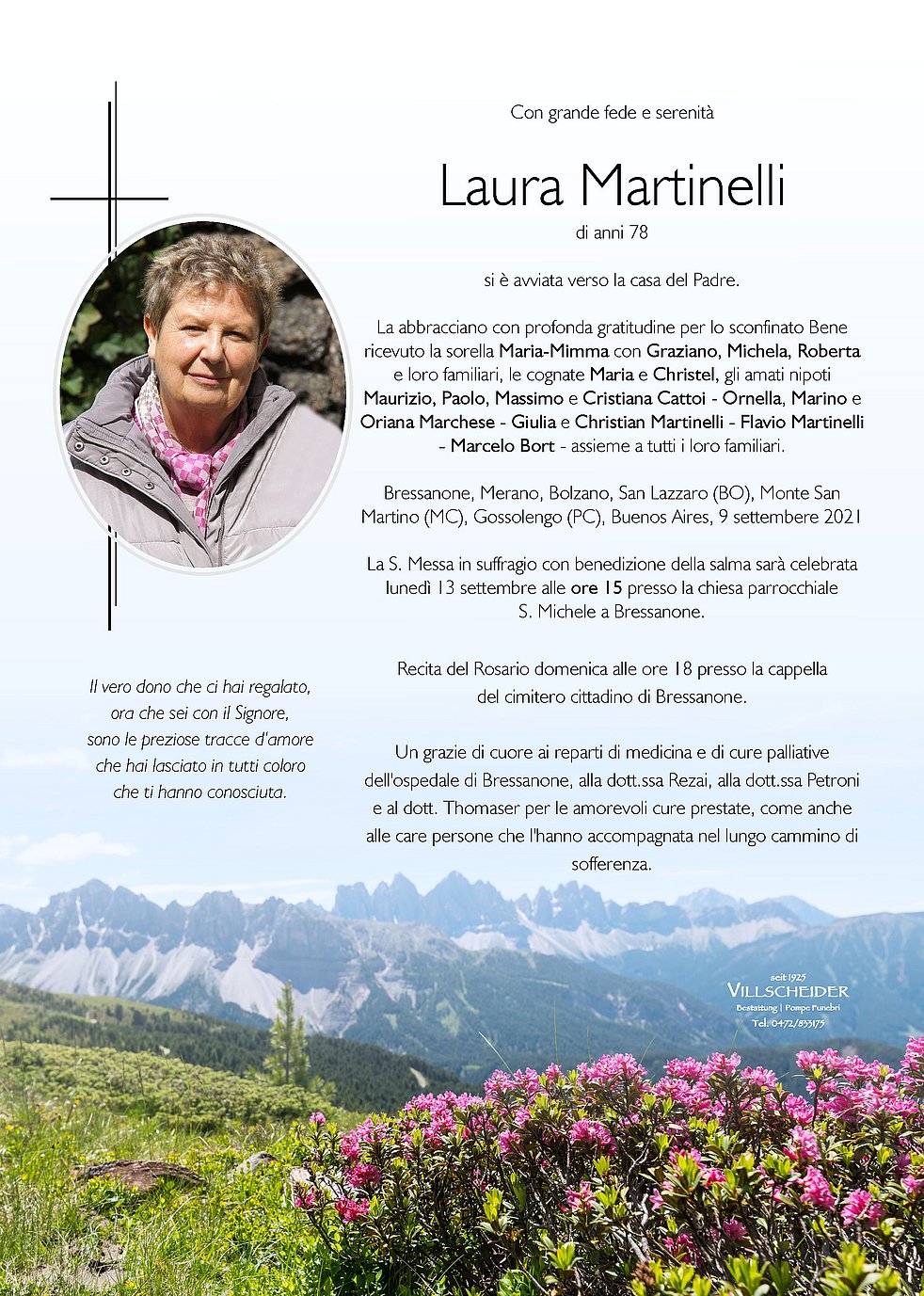 Carissima Laura, per tanti anni hai lavorato come volontaria presso le Residenze per anziani di Bressanone. Eri una persona speciale, sempre disponibile che si è dedicata con tutto il cuore a quello che faceva e soprattutto alle persone alle quali è stata vicina. È stato un onore conoscerti, grazie per il tuo operato... Ricorderó il tuo sorriso... Le mie più sentite condoglianze ai familiari... Magdalena